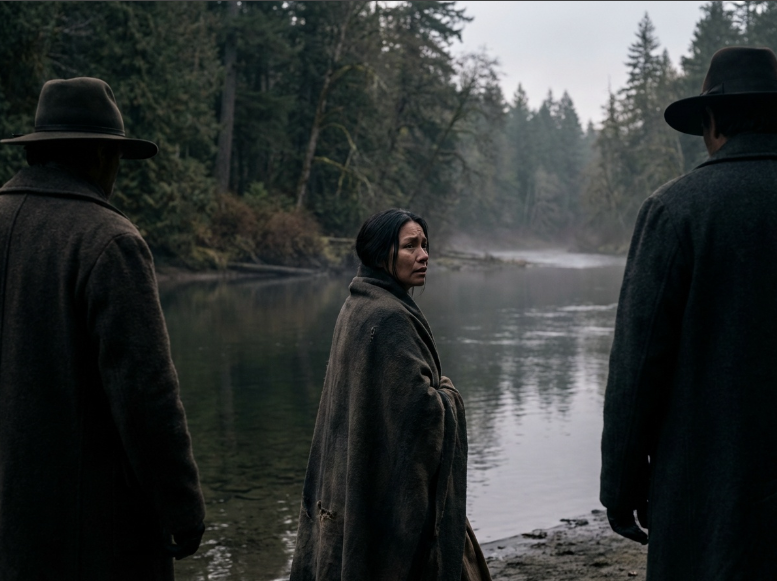 IMAGE PROMPT: A somber cinematic image of a Native American woman on a riverbank being escorted away by shadowed figures in European clothing. Her gaze turns back toward the water and forest. Mood: grief, restraint, injustice. No violence shown. Style: realistic, photorealistic, cinematic lighting, muted natural colors, emotional depth, artistic composition. Landscape.