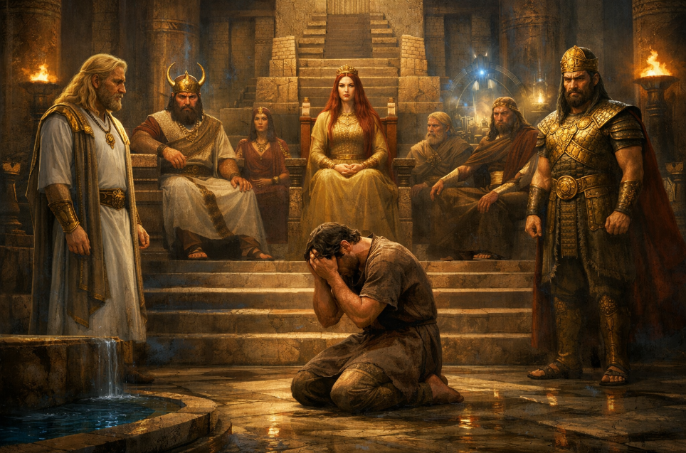 The Anunnaki Council gathered in a grand, ancient Mesopotamian judgment hall, with Enki, fair and noble, with long blondish hair, a short beard, and blue eyes, standing with compassion and authority. Enlil appears powerful and stern. Ninmah stands luminous and regal with long red hair and blue eyes. Marduk watches with intensity. In the center, Ka-in kneels in grief, holding the weight of his crime. The chamber blends ancient ziggurat architecture, polished stone, sacred water channels, and subtle advanced celestial technology. Mood: judgment, mercy, dynastic tension, cosmic law.