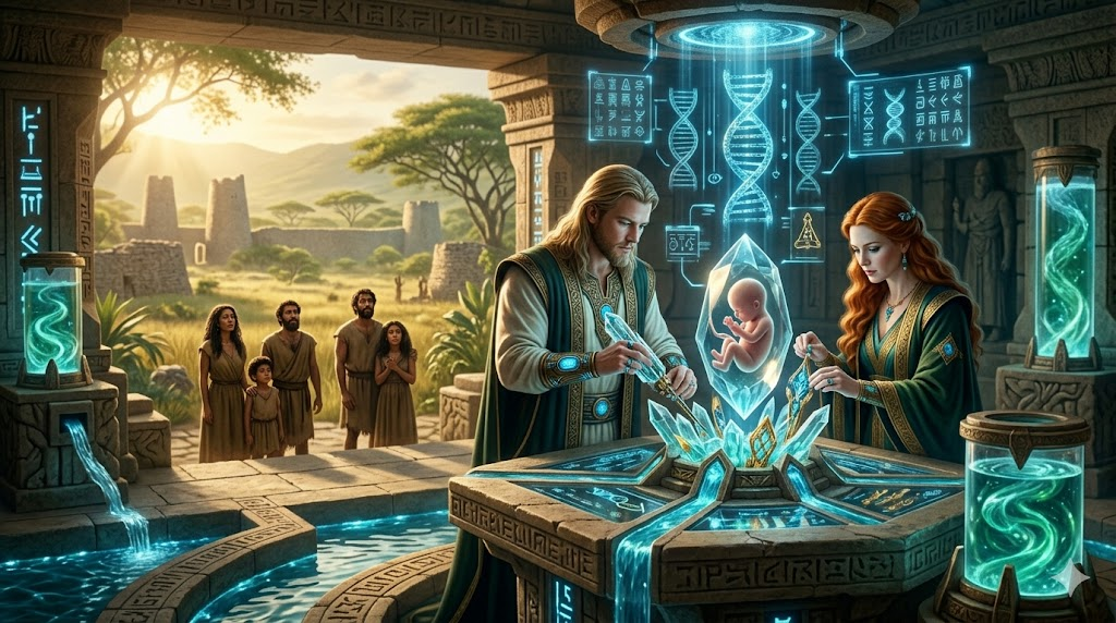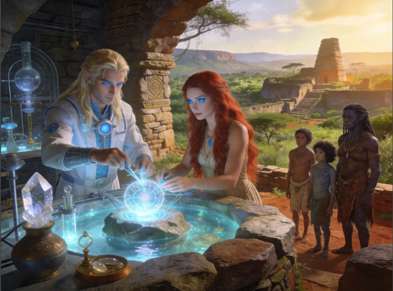 In Enki’s ancient African reserve near Great Zimbabwe, Enki is shown as a fair, blondish, blue-eyed Anunnaki scientist-prince working inside a sacred genetic laboratory that blends natural stone, glowing water, crystalline instruments, and advanced ancient technology. With him, Ninmah, with long, red hair and blue eyes, works beside him in the lab.