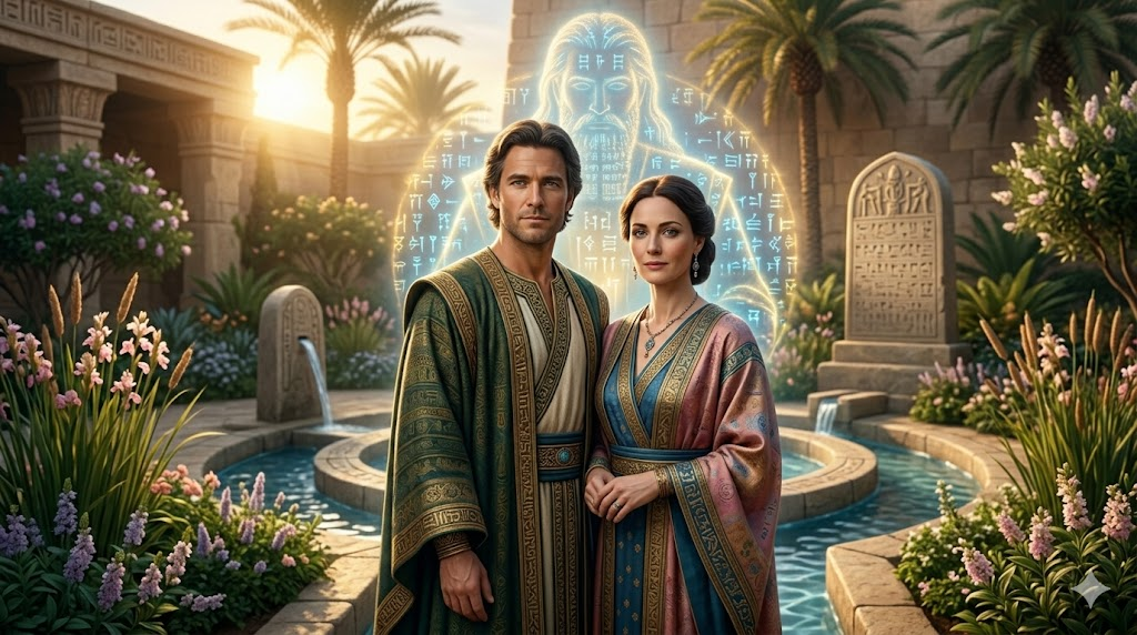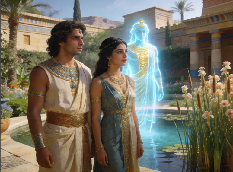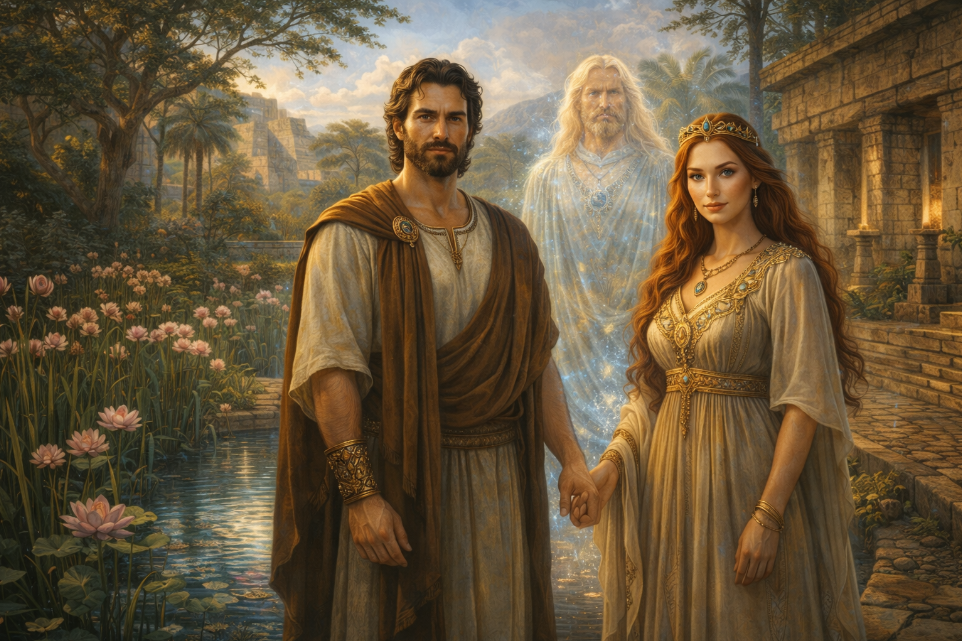 Adapa and Titi, in an ancient Sumerian garden courtyard, stand near sacred water and flowering reeds. They appear as beautiful, enhanced Earthlings with noble bearing, dressed in refined ancient garments.