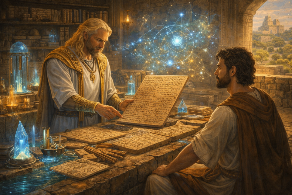 A cinematic full-color scene of Enki teaching Adapa how to keep records in an ancient Sumerian learning chamber. Enki is fair, blondish, blue-eyed, wise, and calm, pointing to clay tablets, star maps, and glowing symbols. Adapa listens with focused intelligence.