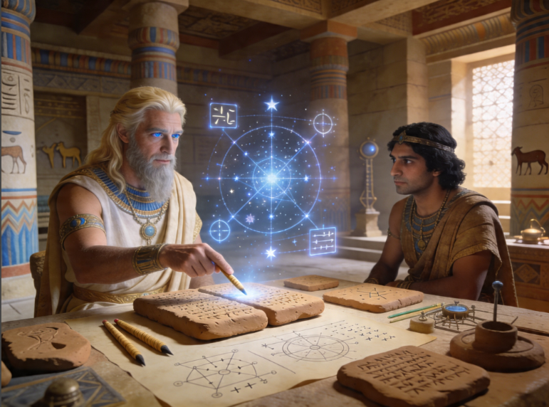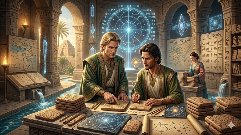 Around them are reed styluses, tablets, mathematical diagrams, irrigation plans, herd records, and subtle advanced devices integrated into ancient architecture. Mood: education, civilization, administration, sacred knowledge, the birth of recordkeeping. FULL COLOR, luminous cinematic fantasy realism, realistic, photorealistic, cinematic lighting, soft natural colors, highly detailed, emotional depth, artistic composition, landscape 16:9.