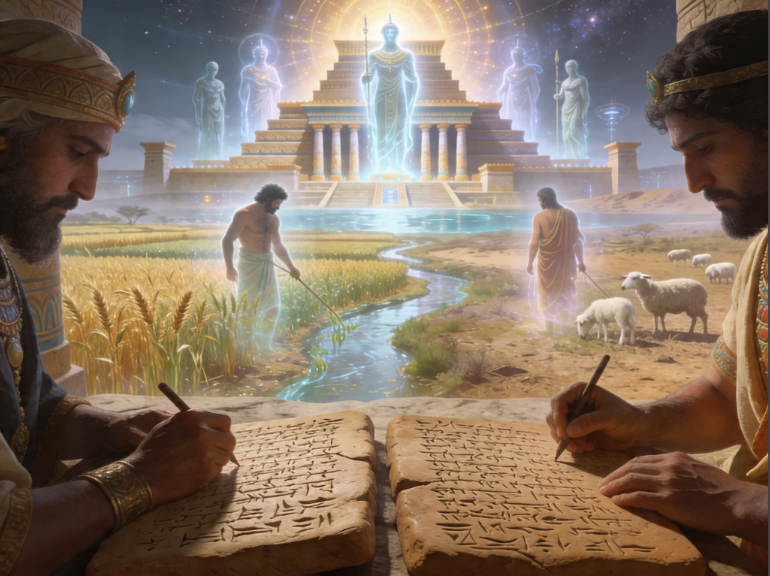 A cinematic full-color featured image showing ancient Babylonian scribes writing sacred texts on clay tablets while, behind them, a translucent mythic vision appears of Cain and Abael in a primordial landscape. One brother stands near cultivated grain fields and irrigation canals, the other near sheep and lambs in dry pastureland.