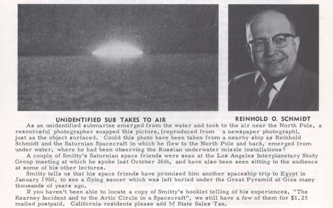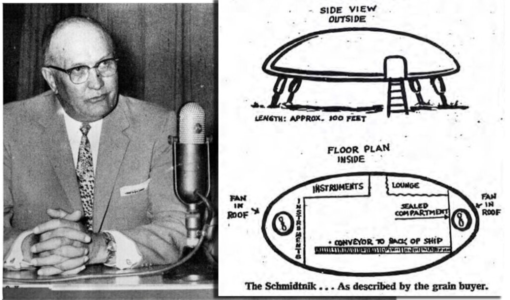 Schmidt was born and grew up in Nebraska, where he worked for most of his adult life as a grain buyer and dealer. In 1938, he was convicted of embezzlement and was imprisoned in the Nebraska State Penitentiary.[2][3] According to Schmidt, on November 5, 1957, while driving through a rural area near Kearney, Nebraska, he saw a large, blimp-shaped object on the ground in a field. He claimed two men left the object and escorted him inside it. On board witnessed a group of four men and two women speaking a language he described as “High German.”[4][5] The group claimed to be from the planet Venus. After a conversation lasting about thirty minutes, Schmidt left the craft and it took off into the air, revealing large propellers at each end.