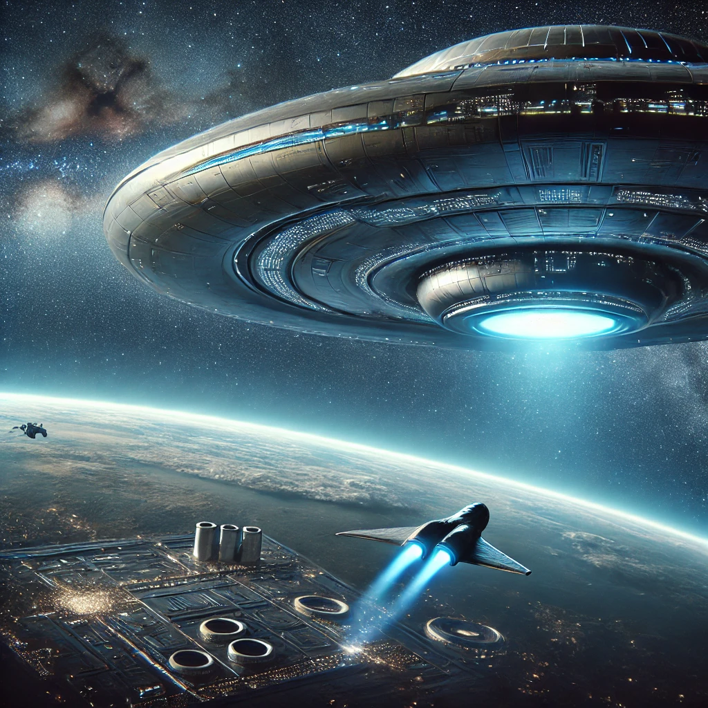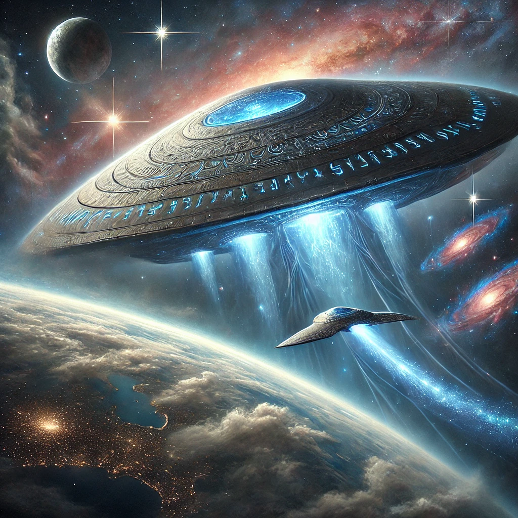 Bathed in starlight and powered by mystic energy, the great Serpo mothership floats in silence above Earth. Intricate glowing symbols—alien yet elegant—circle its massive hull, casting blue auras into space. A sleek scout vessel gracefully descends from its underside, trailing a stream of cosmic light like a comet’s tail. Far beyond, the twin suns of Zeta Reticuli shimmer amidst galaxies and nebulae. Earth lies half-shadowed beneath them, as if unknowingly awaiting contact with its celestial guardians.