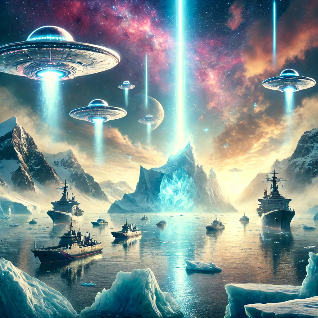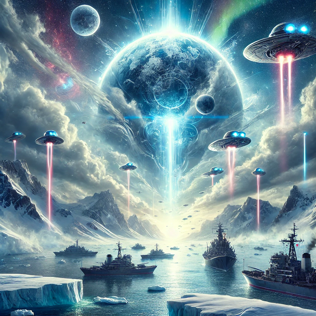 Futuristic naval ships patrol icy waters under glowing auroras, facing off against radiant flying saucers that fill the skies. Beams of energy shimmer between icebergs and clouds, capturing the mythic clash between Earth’s defenders and otherworldly invaders above Antarctica.