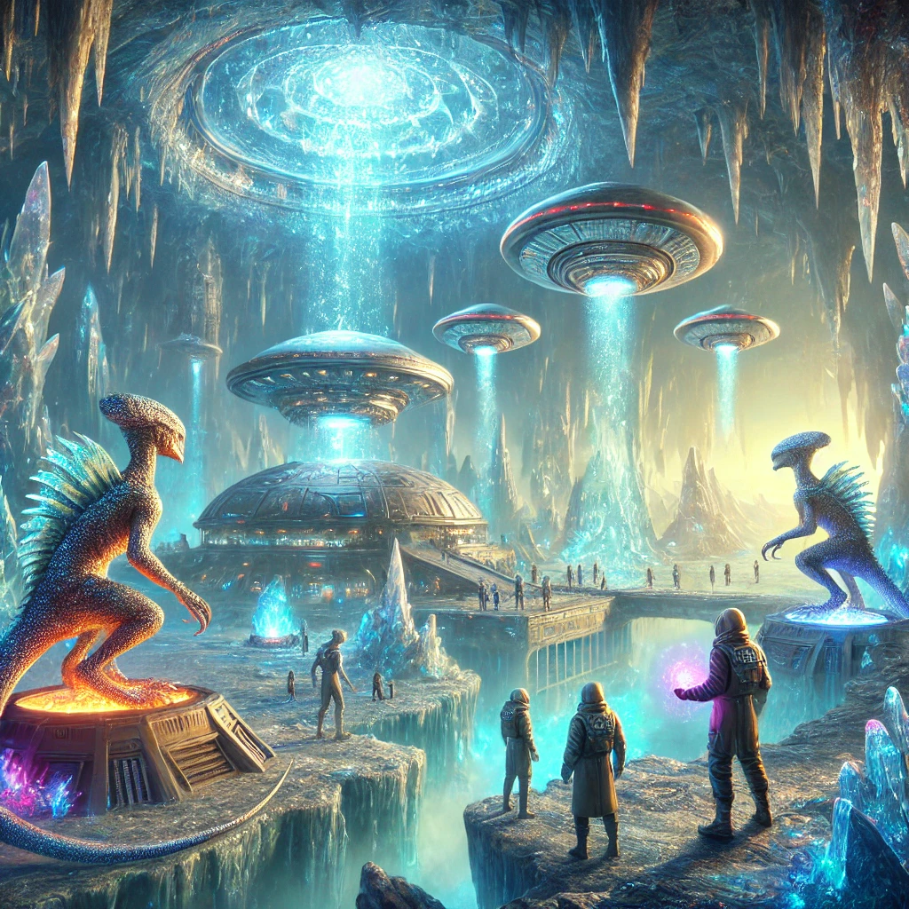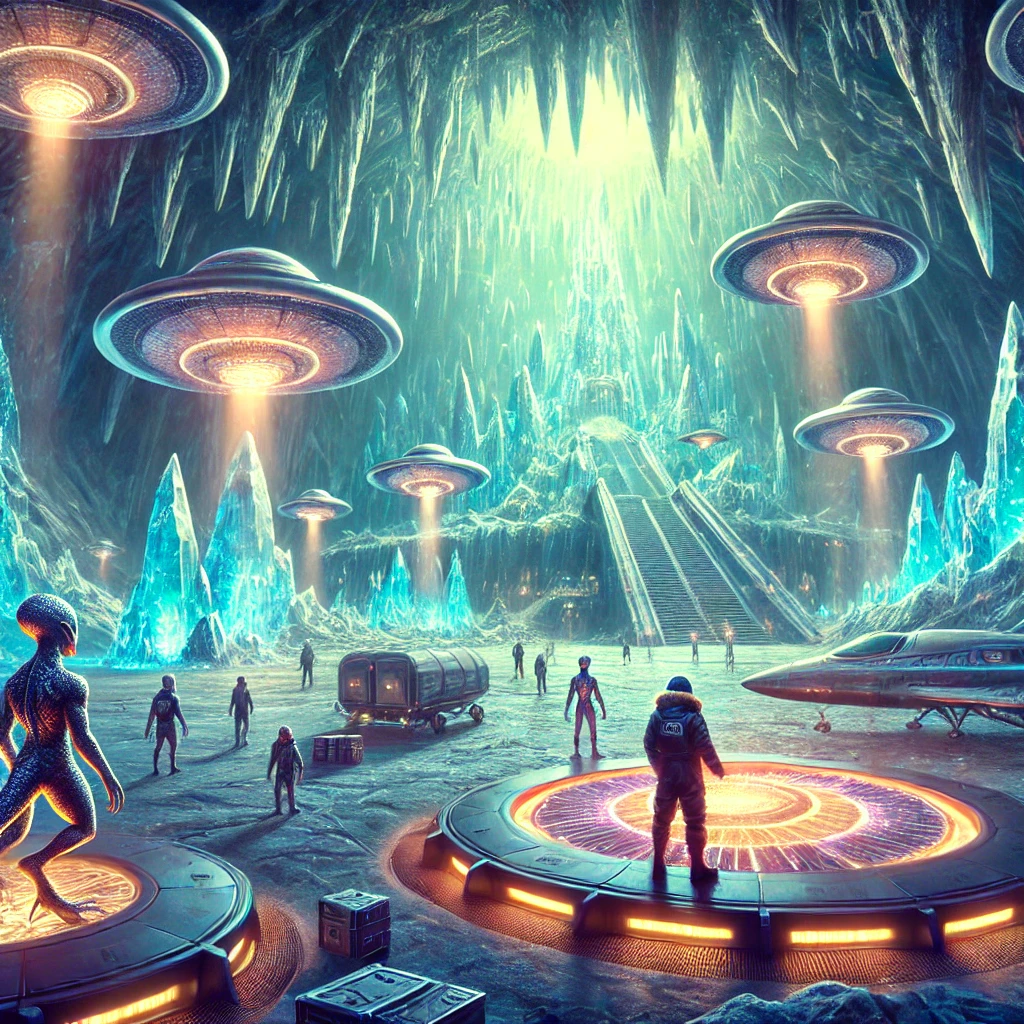 Deep beneath the ice, a glowing crystalline cavern shelters a secret alien stronghold. Shimmering reptilian beings move with purpose through halls of pulsing light and otherworldly architecture. Human figures in sleek sci-fi uniforms consult beside saucer-like ships, as luminous energy flows from ancient alien machinery into the icy walls.