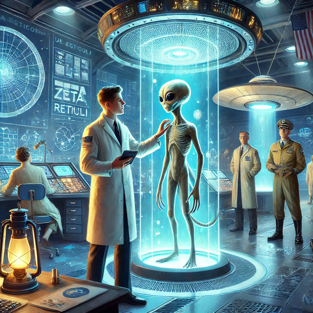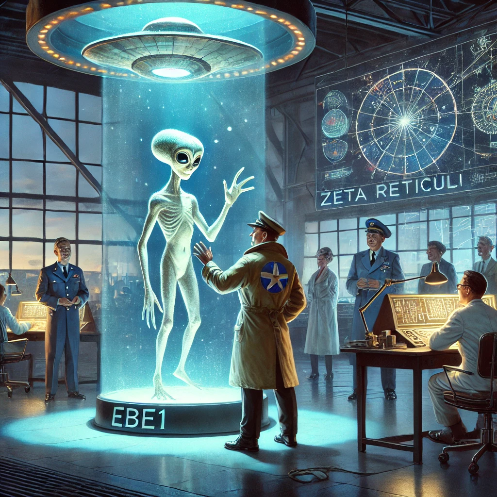 In a hidden military research facility, the crash survivor known as Ebe1 stands calmly under a glowing containment field. U.S. scientists and military officers study the star charts of Zeta Reticuli and examine potential alien technology. Behind them, an antigravity saucer gleams under soft lights, marking the start of a secret alliance that would reshape humanity’s reach into the stars.