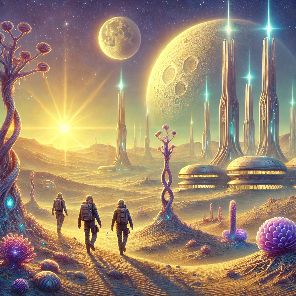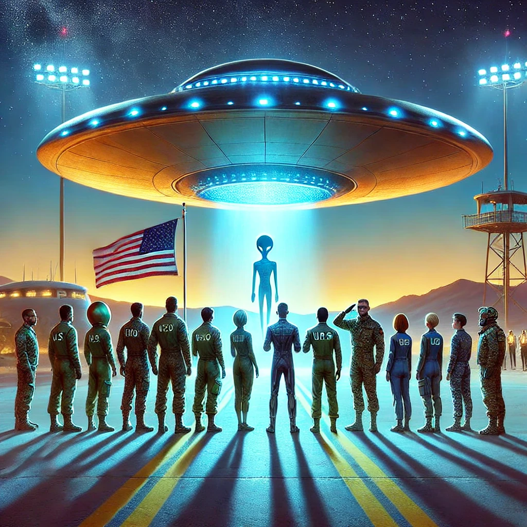 At a secret desert base under starlit skies, twelve hand-picked Americans stand ready beside a glowing alien saucer. As dawn breaks behind distant mountains, a Serpo being descends in radiant blue light to greet them. This historic moment marks the beginning of humanity’s first journey to a distant world, guided by allies from the stars.