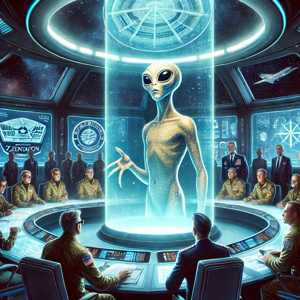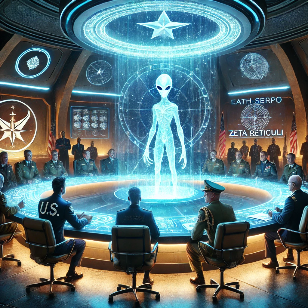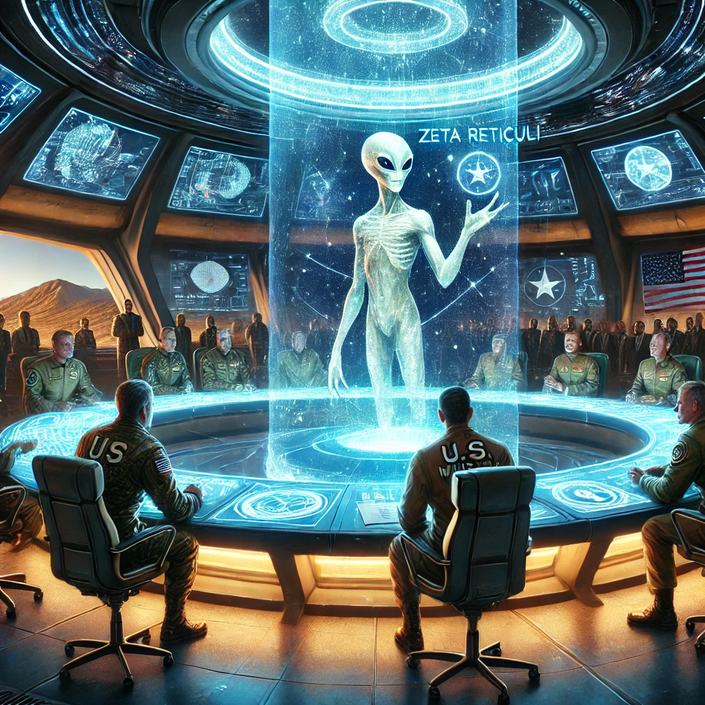Inside a high-security military chamber, a luminous alien ambassador stands in a projection field, delivering vital star-system data to U.S. officers. Around a glowing table, decorated generals and scientists absorb the Zeta Reticuli transmission—a moment of unprecedented cooperation between worlds.