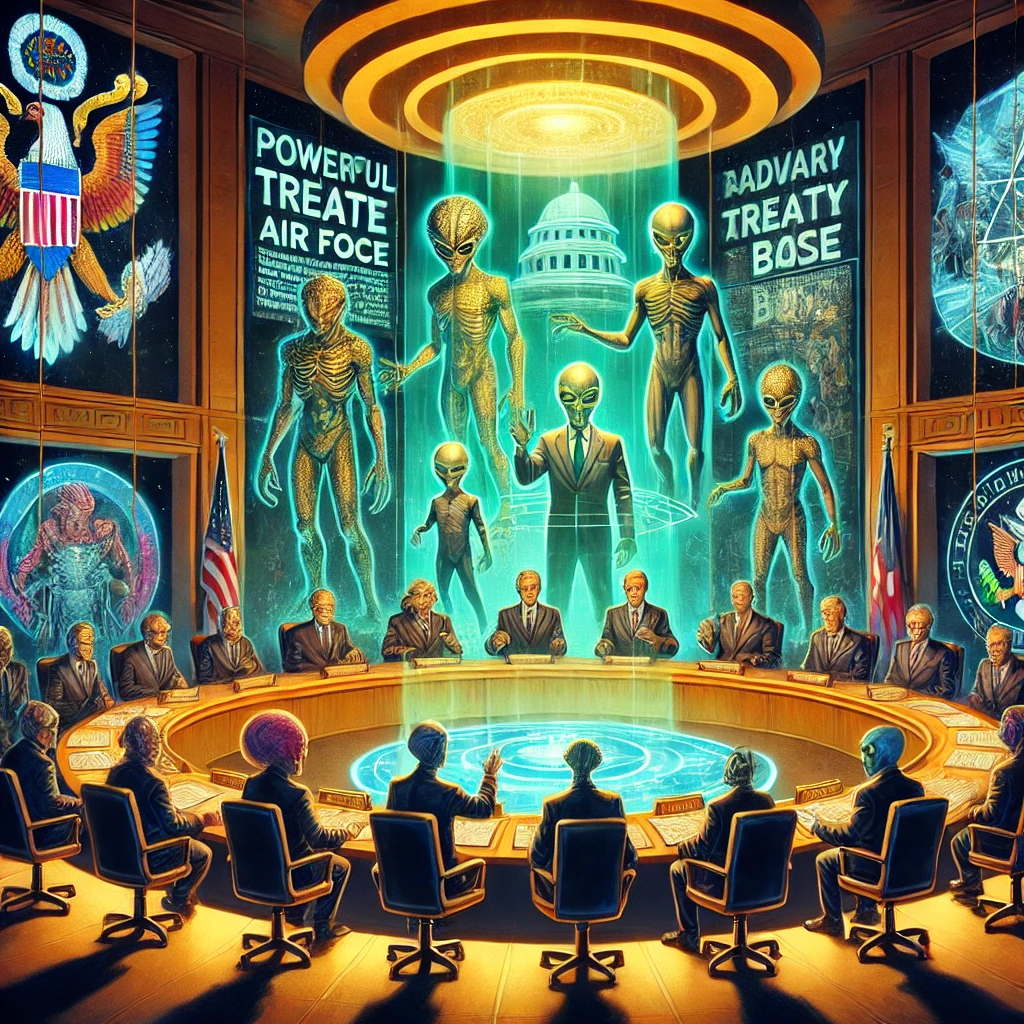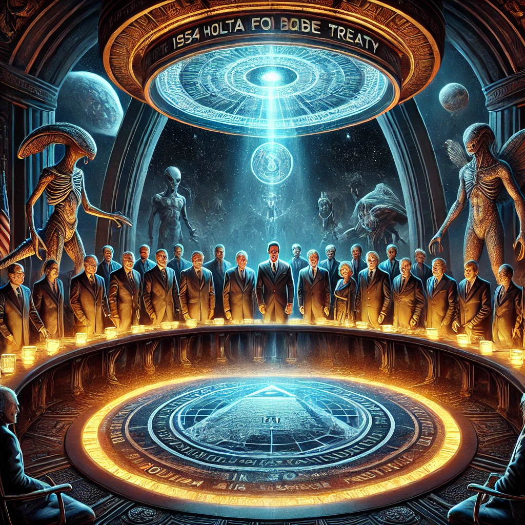Beneath a glowing alien dome, world leaders gather around a circular chamber etched with arcane symbols. Above them, the 1954 Holloman Treaty is projected in radiant light as Reptilian and Grey entities loom silently in the shadows. A cosmic star map spins above the table, reflecting Earth’s fragile sovereignty caught between hidden powers and interstellar influence.