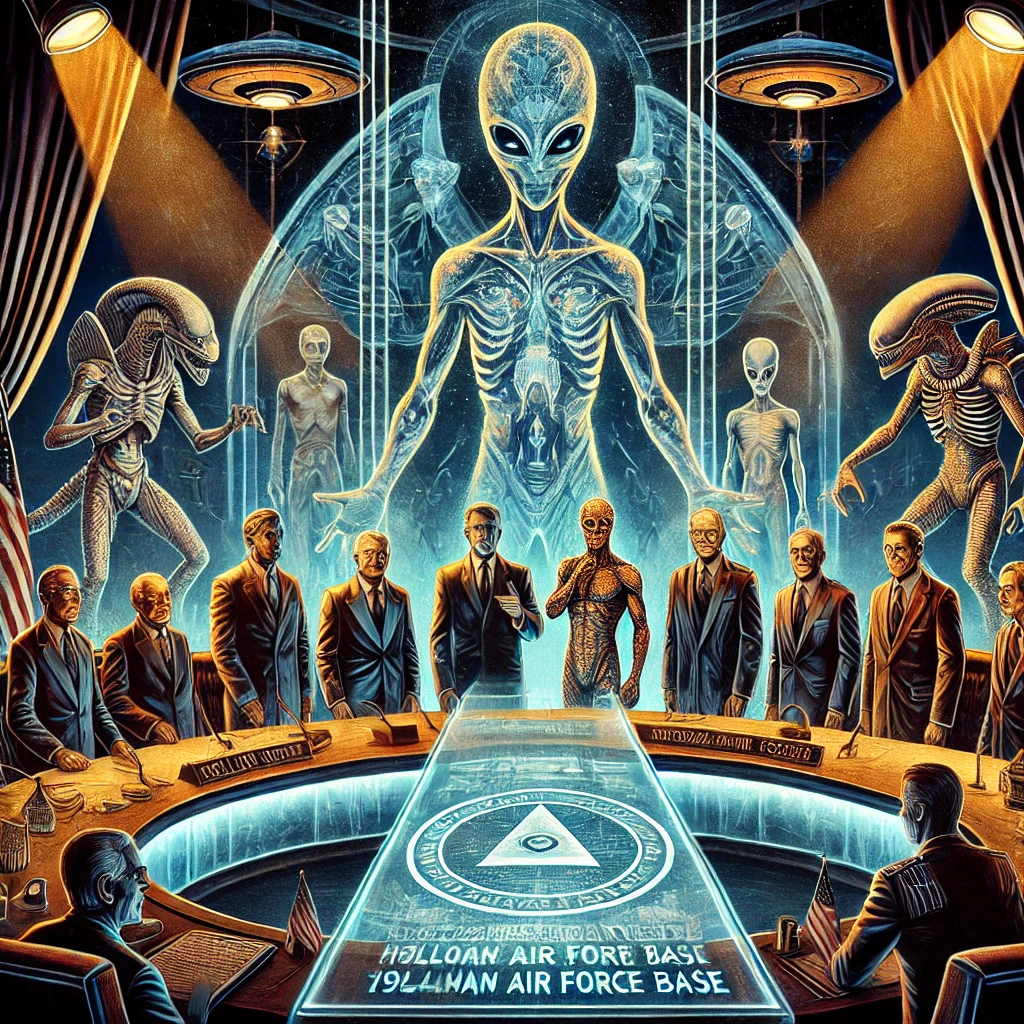In a hidden council room, world leaders sit under the silent command of towering alien figures—Greys and Reptilians looming in holographic light. Behind glowing panels marked “1954 Holloman Air Force Base,” hybrid beings emerge from advanced labs. A symbolic blend of secrecy and surrender, this image captures the moment humanity bartered freedom for knowledge.