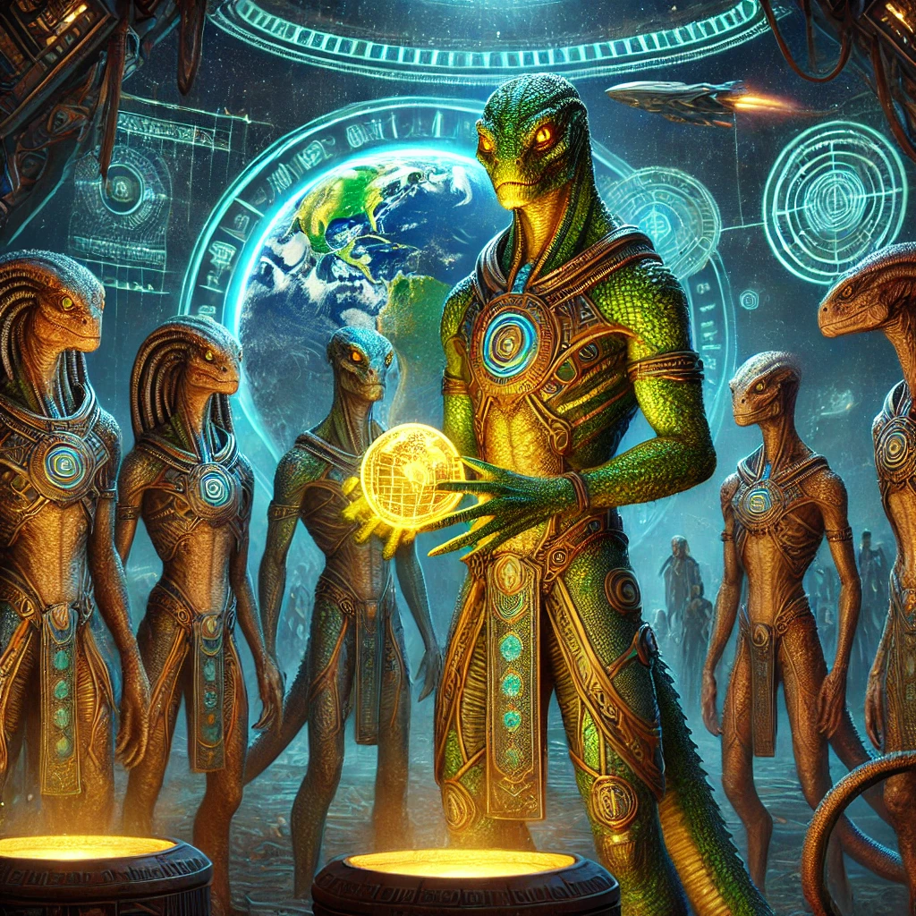 Towering in a shadowed chamber etched with alien glyphs and glowing star maps, the Reptilian beings stand with quiet authority. Their bronze-green scales shimmer beneath ceremonial armor as one holds an orb pulsing with interstellar knowledge. Beyond them, a cosmic screen shows Earth suspended in space. Mysterious, ancient, and commanding, these entities raise an unsettling question: Are they protectors, deceivers, or something beyond our understanding?