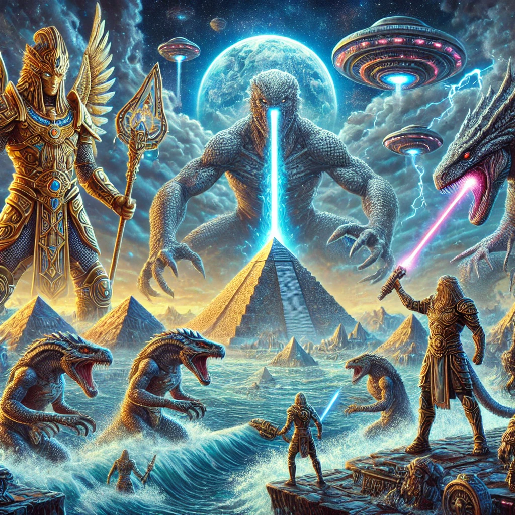 As Lemuria crumbles into storm-tossed seas, the Atlans—glorious warriors from the Pleiades—battle the Reptilian invaders with blazing energy weapons and shimmering armor. Reptilian forces, armored and relentless, retreat through crumbling temples and into underground sanctuaries beneath the Indian subcontinent and Antarctica. Lightning tears through the sky, pyramids collapse, and the ancient world drowns in fire and water—the price of galactic defiance.