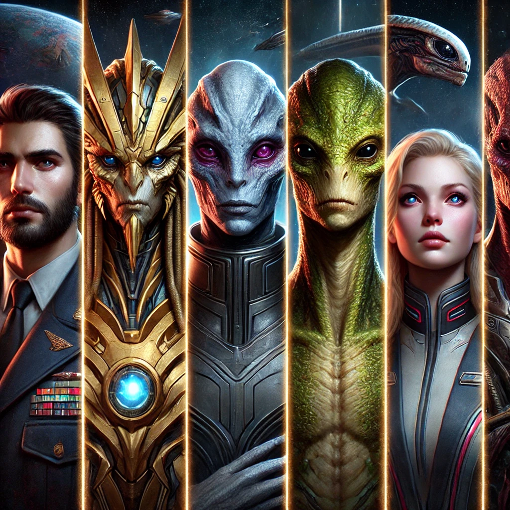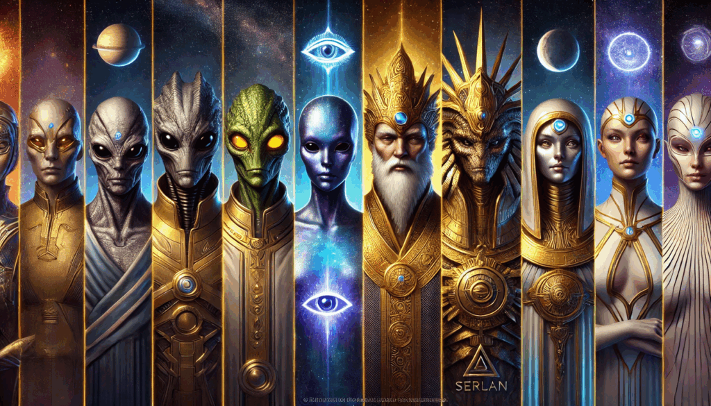 Beneath the gaze of nebulae and ancient constellations, six galactic powers face forward: the analytical Grey, the commanding Reptilian, the radiant Anunnaki, the peaceful Serpo envoy, a wise human-hybrid bridge being, and the noble Atlan warrior. Their unity—or discord—shapes the destiny of countless worlds.