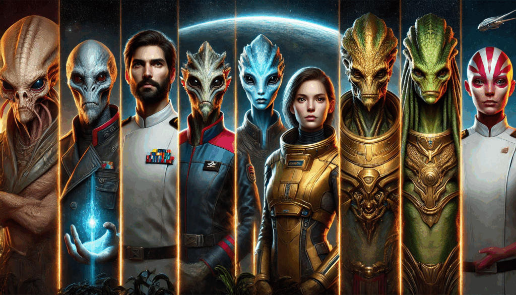 Beings—each from a different world and agenda—stare directly into the unknown. A human military commander and a futuristic scientist flank a radiant Atlan warrior, a solemn Grey, a gentle Serpo emissary, and a calculating Reptilian. Lit by cosmic glow, their expressions reveal duty, mystery, and power in a galactic drama unfolding across time.