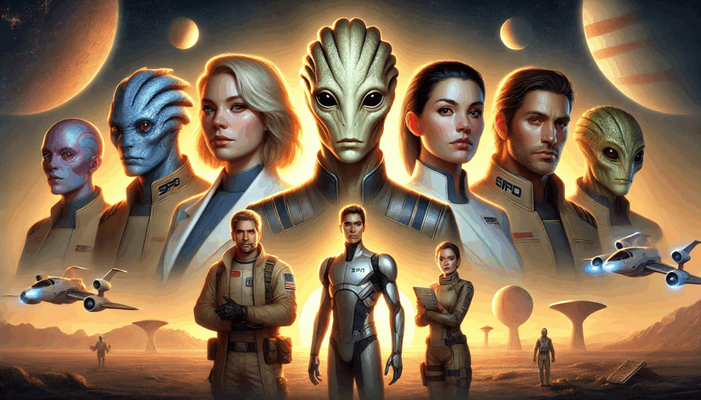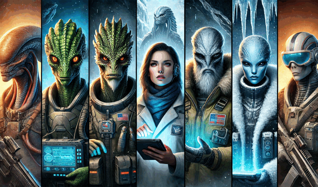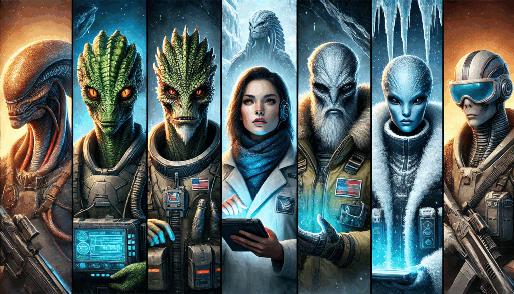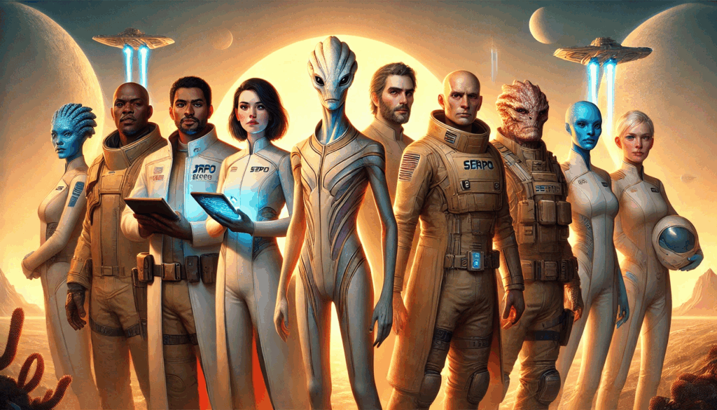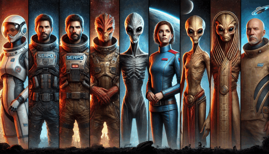 Side by side, six central beings stare into the unknown: a brave Serpo exchange astronaut, a mission doctor, a Reptilian emissary, a Grey scientist, a dignified Anunnaki elder in ceremonial robes, and a hybrid diplomat blending human and alien traits. Lit against a galactic backdrop, each figure reflects a chapter in the unfolding saga of cooperation, manipulation, and cosmic diplomacy.