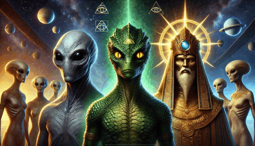 Beneath a galactic sky, three alien leaders face forward in solemn command: the calm and calculated Grey, the piercing gaze of the armored Reptilian, and the radiant Anunnaki elder crowned in ancient wisdom. Symbols of control, secrecy, and cosmic hierarchy float behind them—silent watchers over Earth’s forgotten treaties and hidden wars.