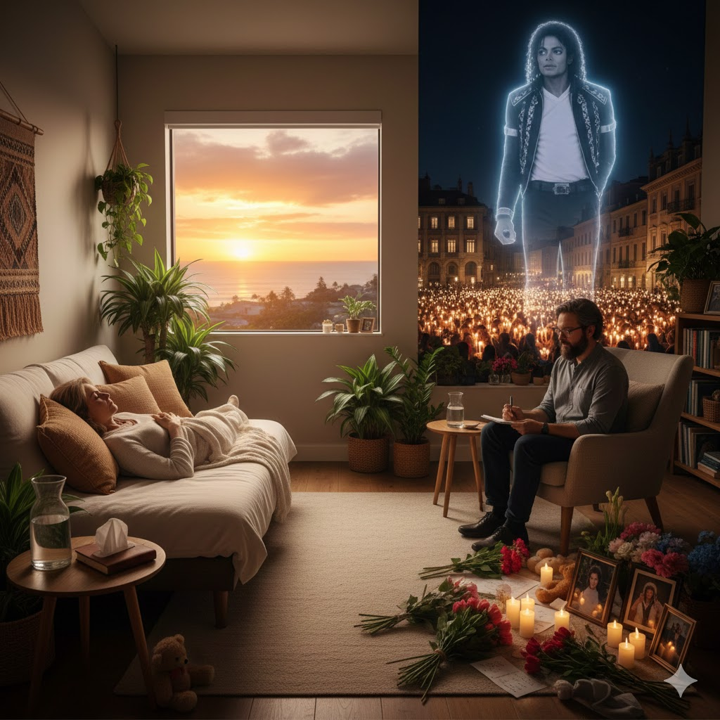 The environment was meticulously prepared. Following a light breakfast, we utilized our living room futon—a space offering a serene horizon view. Sasha assumed his familiar role, equipped with water, tissues, and the clinical precision developed over thousands of therapeutic sessions. We were ready to help the world’s most famous entertainer process the transition from life to the afterlife.