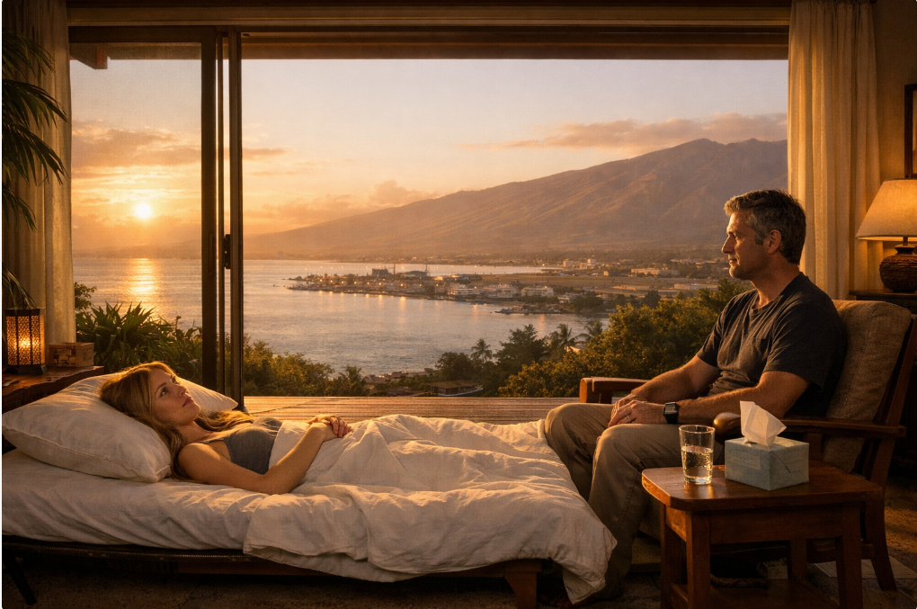 Photorealistic cinematic interior of a Maui living room at sunrise. Large sliding glass doors reveal Kahului harbor and airport in the distance, ocean on the left, Haleakala on the right. Soft golden dawn light fills the room. A futon is opened and neatly prepared facing the horizon. A petite, slender, fit woman (5’2”, long sandy blonde hair, bangs, blue eyes, youthful appearance) lies calmly on the futon. A tall, handsome man with evenly blended brown salt-and-pepper hair and blue eyes sits in a nearby chair with water and tissues on a small side table. Atmosphere peaceful, anticipatory, sacred. No exaggerated age lines.