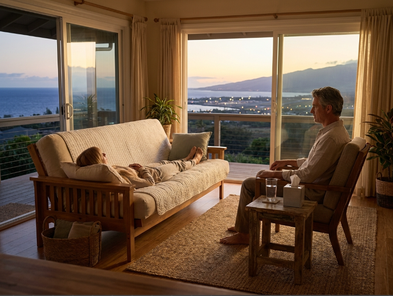 - The Ritual Space: A wide-angle shot of a peaceful, sunlit living room with a futon near a large window looking out at a Maui horizon.