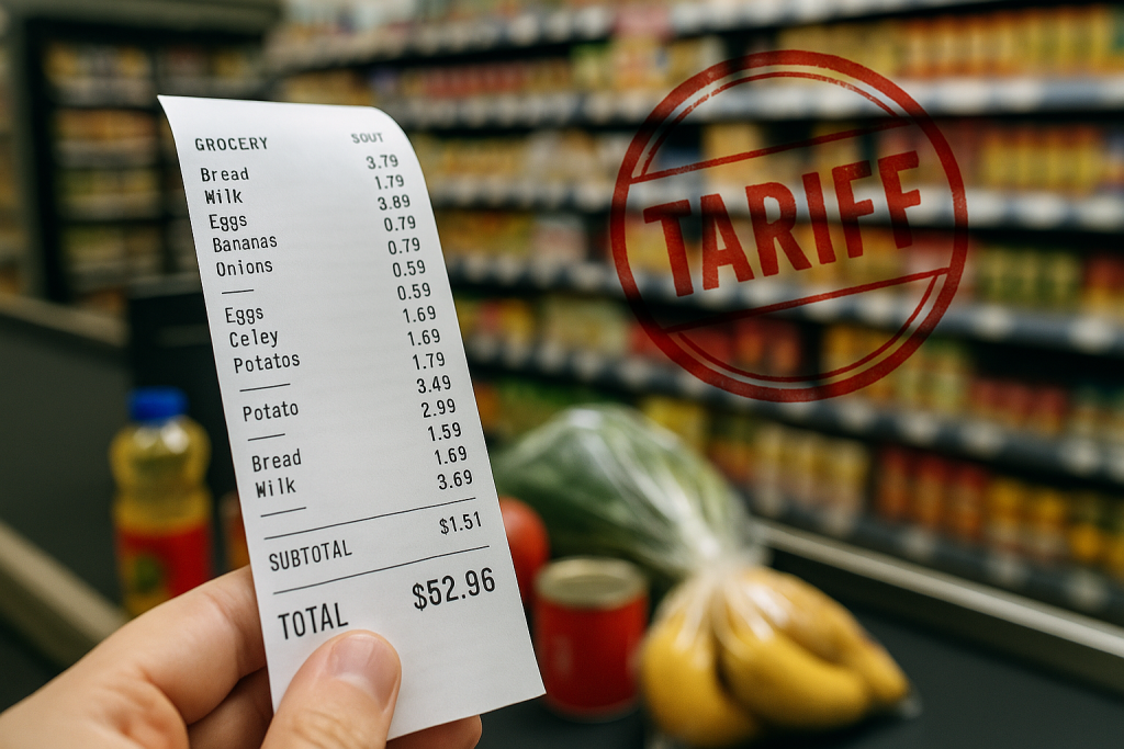A grocery receipt showing everyday items totals $52.96, stamped boldly with “TARIFF.” This visual shows how Trump’s economic policies directly impact American families at checkout.