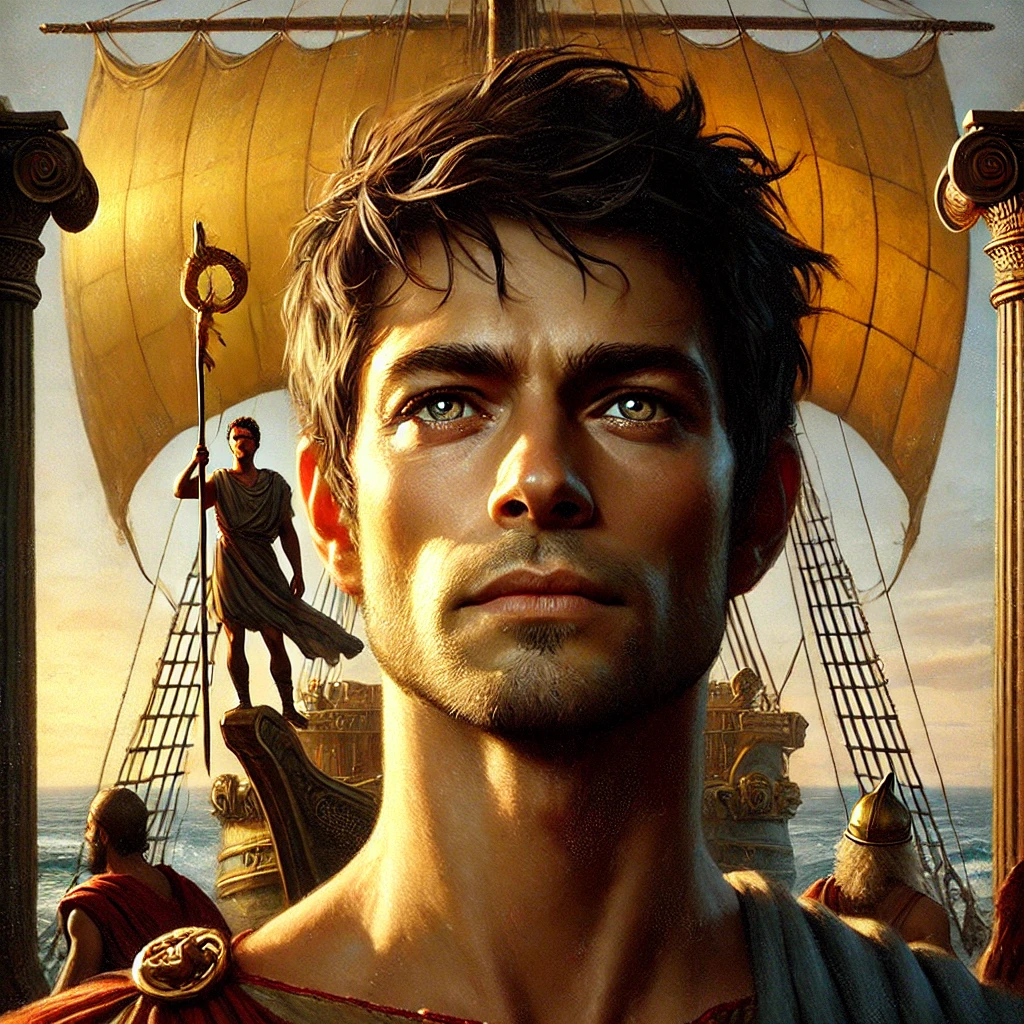 Lit by golden light, Jason stands resolute on the prow of the Argo, the Golden Fleece lifted high. His face is calm but commanding, and his eyes are sharp and purposeful. His windswept hair and confident posture mark him as the returning hero—the rightful ruler, fulfilling prophecy and oath alike as the shores of Iolcos draw near.
