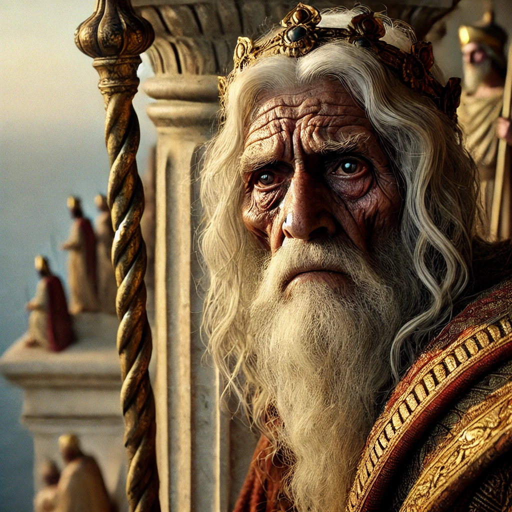 Inside the marble halls of Iolcos, Jason confronts the aged King Pelias. The hero stands tall, the Golden Fleece draped over his arm, his gaze locked on the king. Though withered by age, Pelias leans forward with unexpected fire, eyes blazing as he snarls his denial. Attendants look on in stunned silence, shadows stretching beneath tall columns. The torchlit air crackles with betrayal as the rightful claim collides with royal stubbornness.
