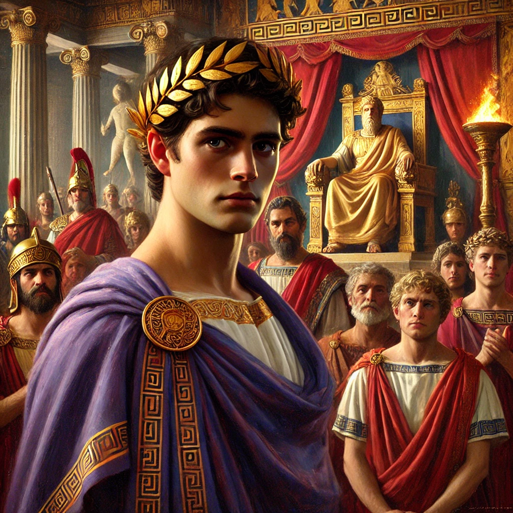 Within the solemn throne room of Iolcos, Acastus stands before the ancient seat of his father, now draped in regal crimson. Crowned in gold and robed in purple, he is proclaimed king by priests and nobles. Jason and Medea stand apart, their expressions unreadable. The room, adorned with torches and frescoes, echoes with formal chants. Yet beneath the ceremony lies a current of tension — a kingship born not of triumph, but of blood.