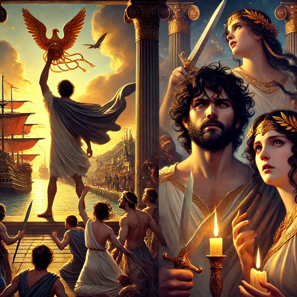 Triumphant Jason holds the radiant Golden Fleece aloft as the Argonauts gather behind him at the harbor of Iolcos. The golden light of dawn shines on classical columns and anchored ships. On the right, a sinister subplot unfolds: Medea, draped in dark robes, whispers to King Pelias’s daughters, drawing them toward a bubbling cauldron. Their eyes flicker with doubt and fascination.