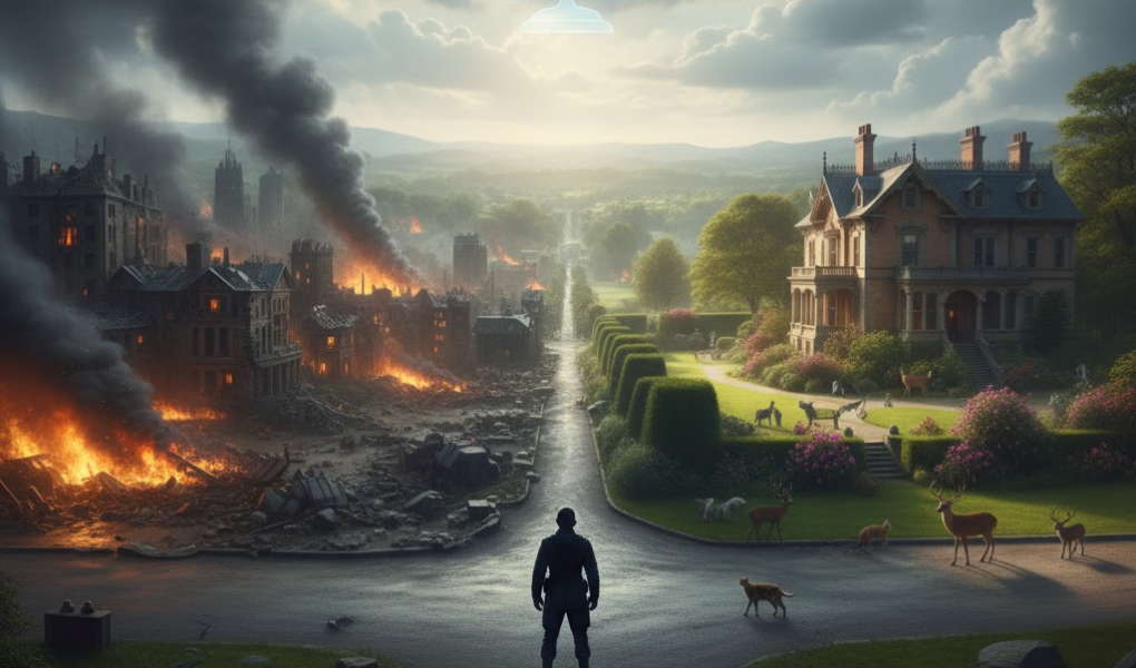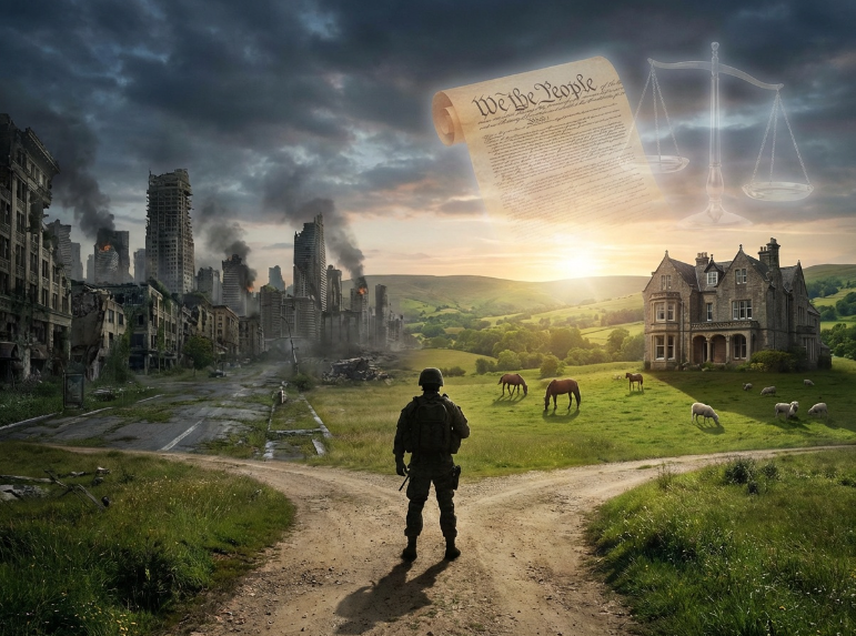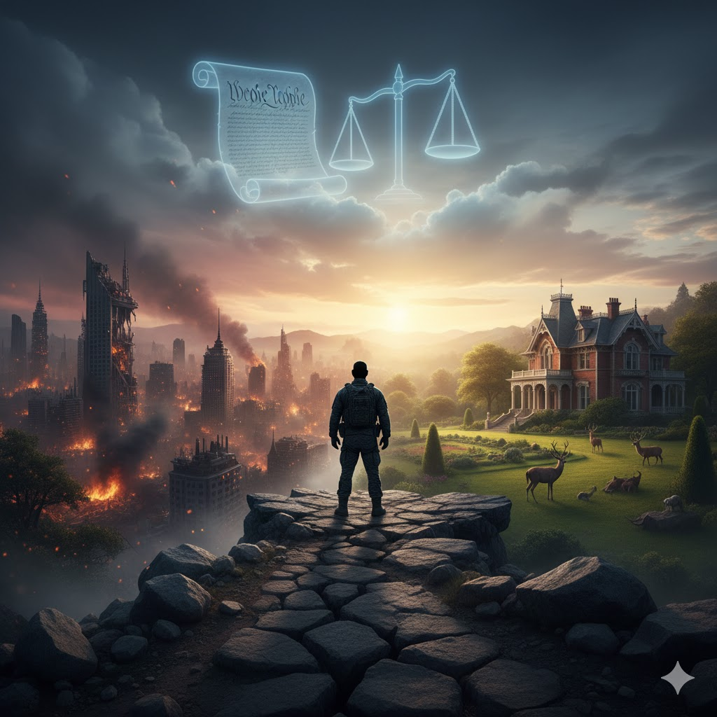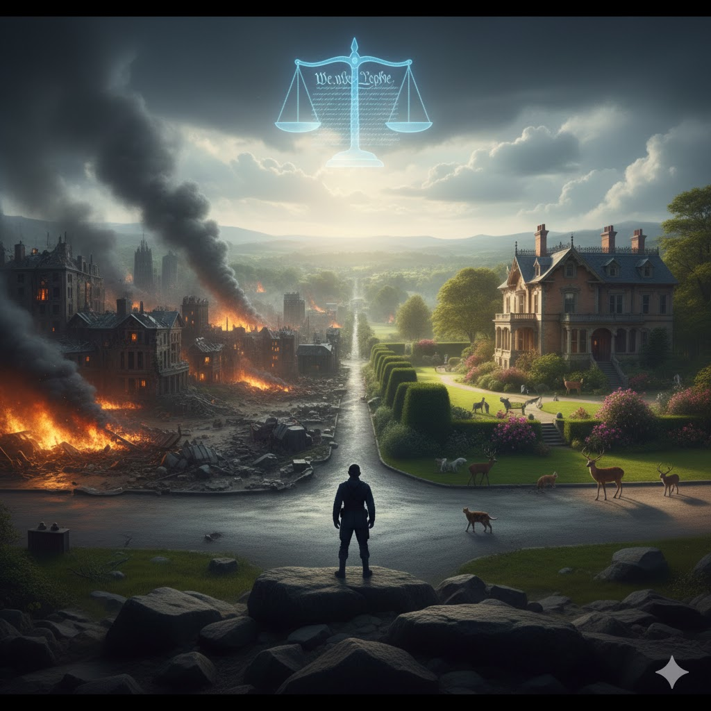 - Prompt: A cinematic landscape showing a silhouette of a soldier standing at a crossroads. On one side, a decaying city representing chaos; on the other, a lush valley with a historic Victorian estate and animals. In the sky, a faint, translucent image of the U.S. Constitution and scales of justice. Photorealistic, epic scale.