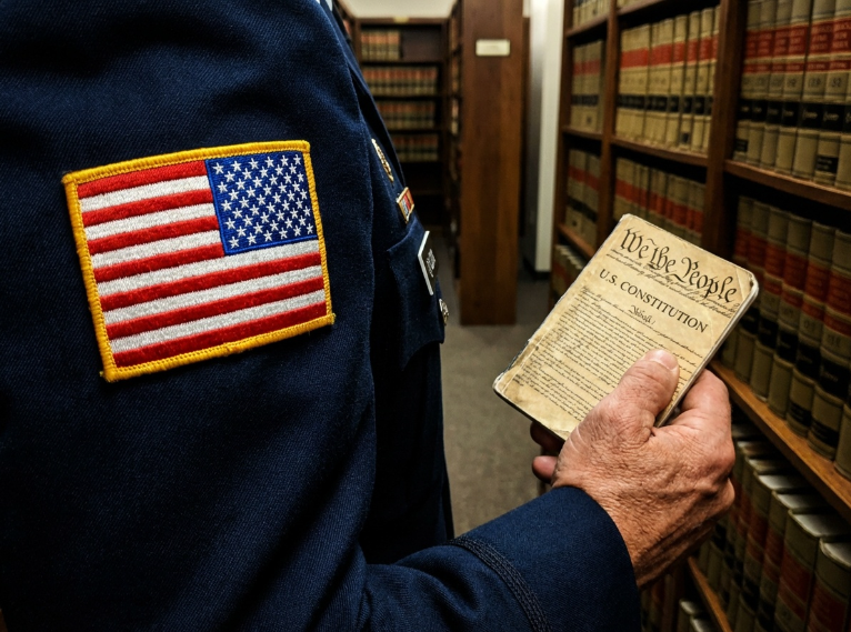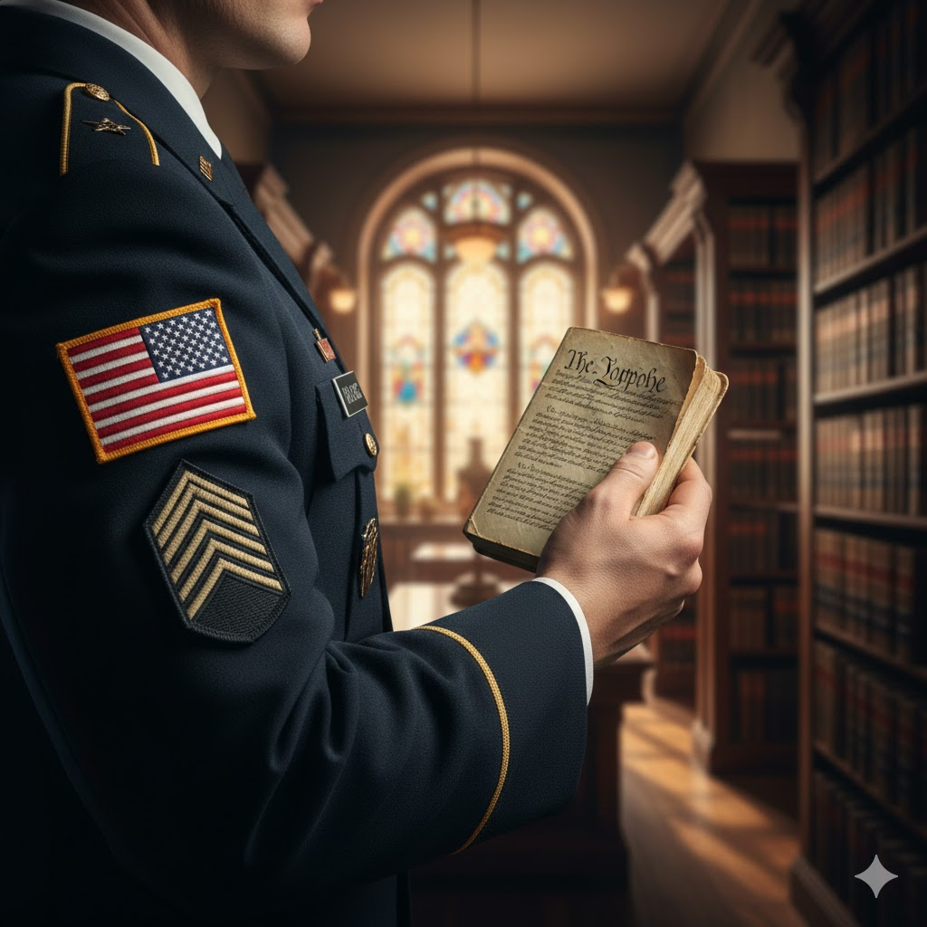 - Prompt: A professional close-up shot of a military dress uniform sleeve with an American flag patch, with a hand holding a small, weathered copy of the U.S. Constitution. Blurred legal library background. High contrast.