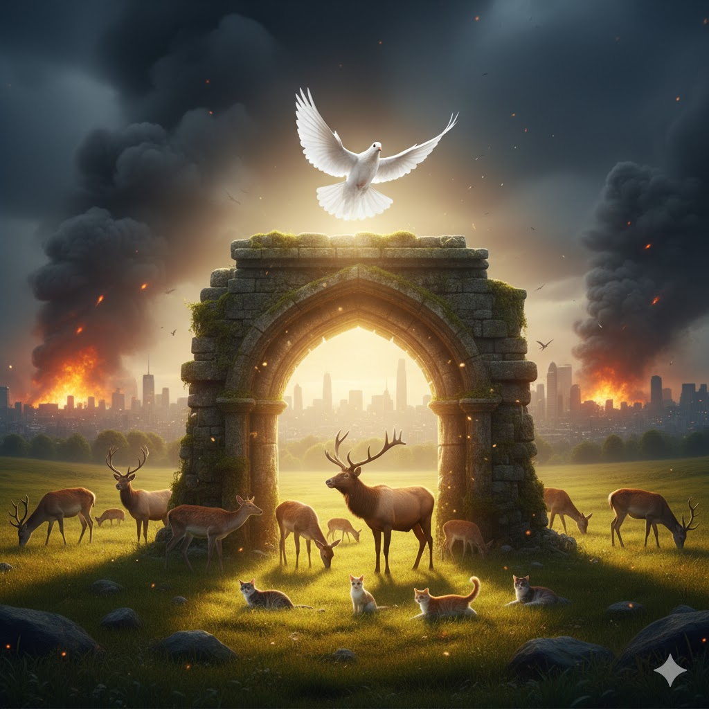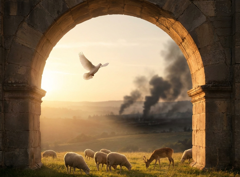 - Prompt: A symbolic image showing a white dove flying over a historic stone archway. In the background, distant smoke, but the archway and peaceful animals beneath it remain in light. Cinematic, photorealistic.