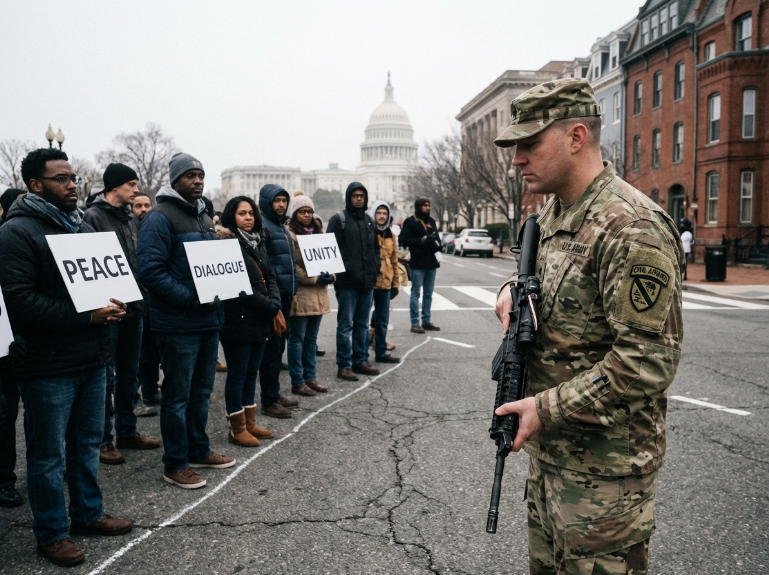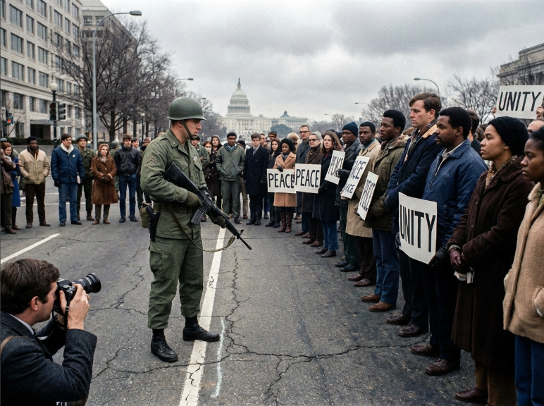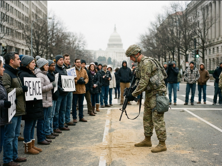 - Prompt: A military officer standing at a line in the sand on a city street. On one side are peaceful civilians; the soldier is lowering their weapon, looking toward the civilians with respect. U.S. Capitol dome in the distance. Documentary style.