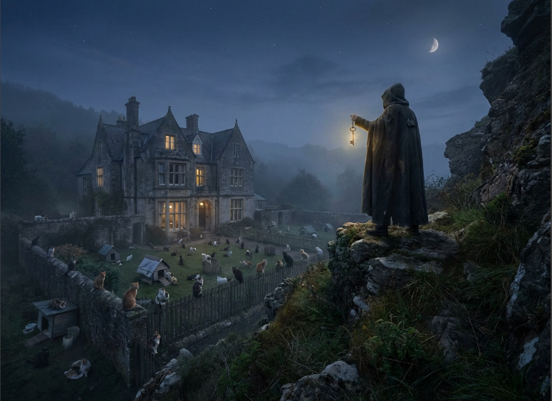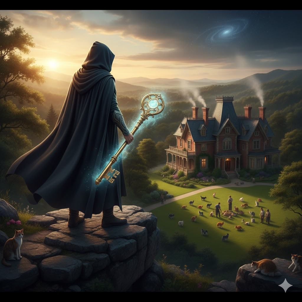 - Prompt: A powerful image of a cloaked figure (The Timelord/Guardian) standing on a cliffside, looking down at a beautiful Victorian estate and a cat colony. The figure holds a glowing key. Fantasy realism.