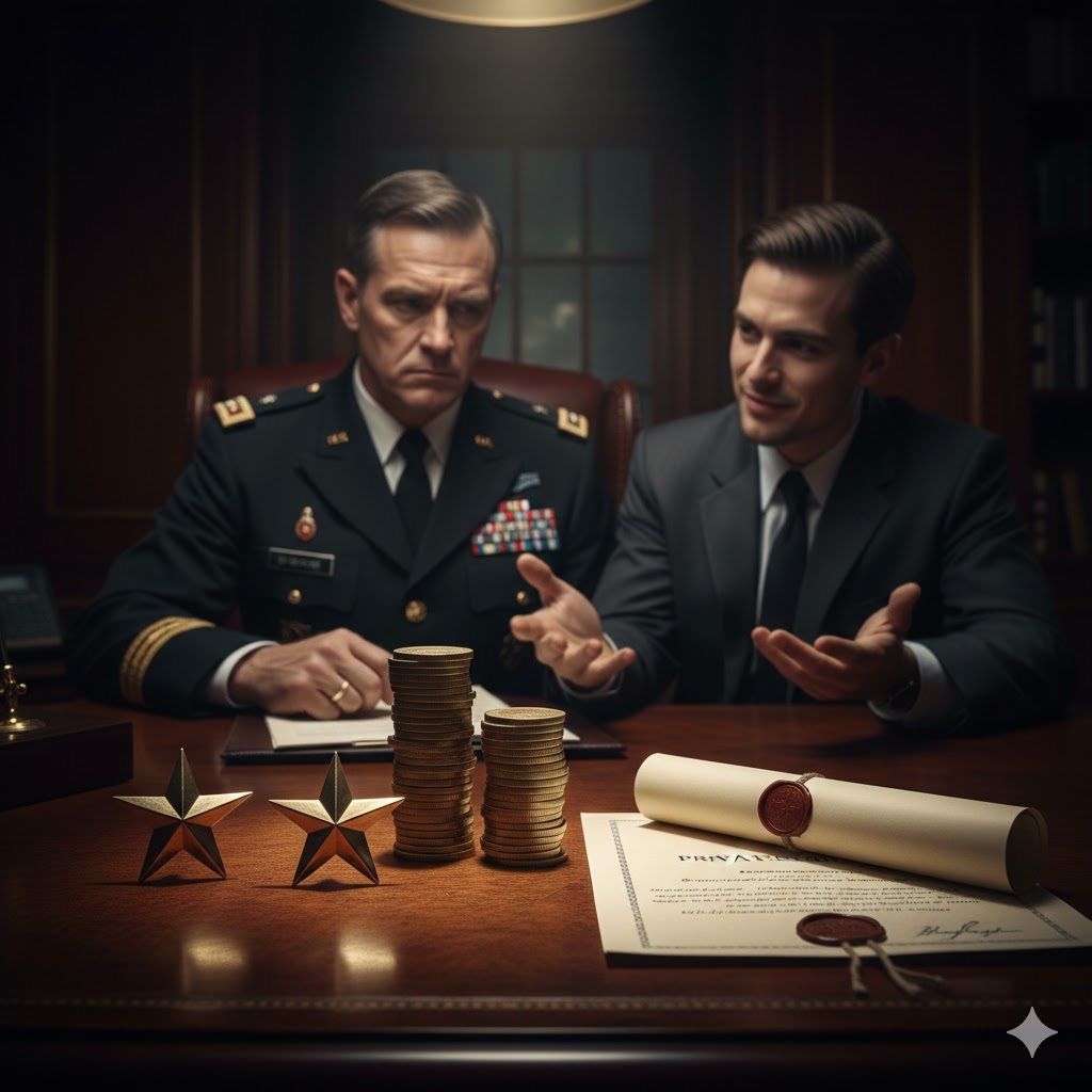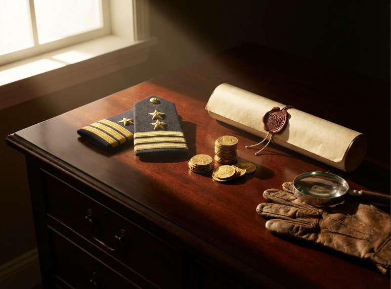 - Prompt: A conceptual image. Military rank insignia sitting on a mahogany desk next to a stack of gold coins and a deed to a private estate. Dramatic lighting, representing the choice between duty and corruption.