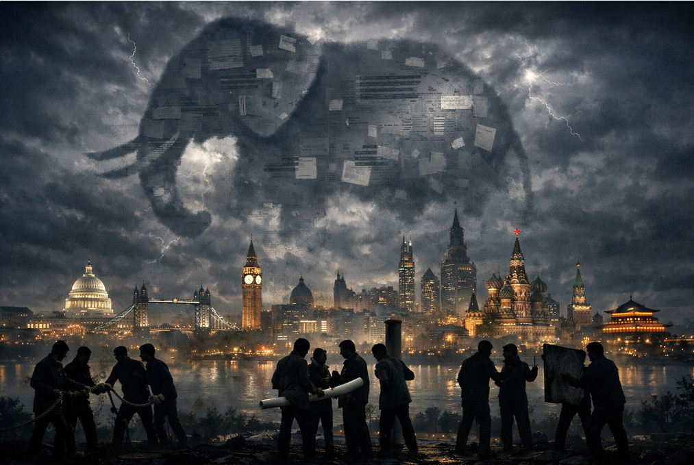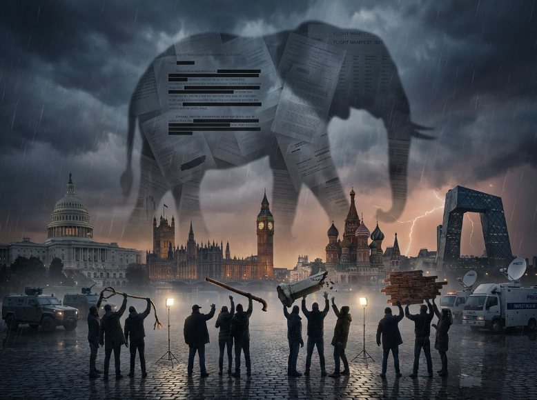 Prompt: Epic cinematic photorealism, landscape 16:9. Nighttime cityscape blending subtle hints of Washington D.C., London, Moscow, and Beijing into one unified skyline. In the clouds: a colossal elephant-shaped shadow formed from drifting documents, redaction bars, and faint flight-log text—symbolic, not literal. Below: small groups of silhouetted people arguing, each holding a different object (rope, pipe, pillar, wall fragment) to symbolize partial perception. Natural colors, dramatic but grounded lighting, documentary tone, high detail, no caricatures, no gore.
