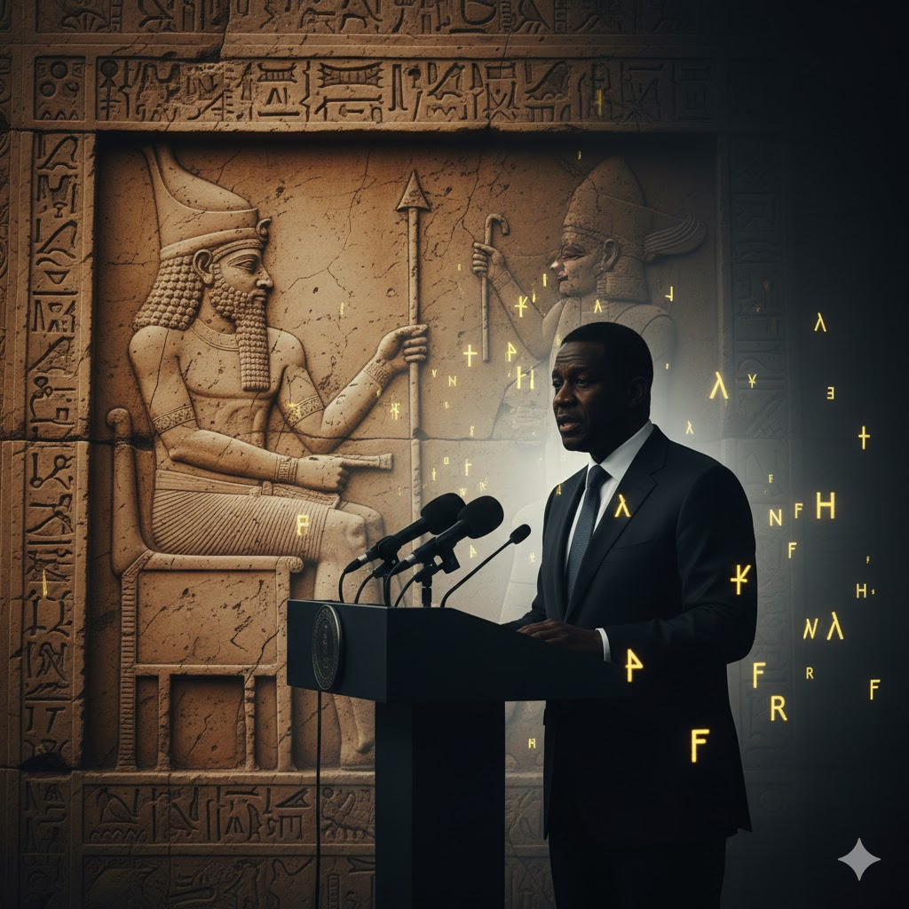 - Prompt: A striking double exposure. One layer is a weathered, ancient Mesopotamian stone carving of the god Marduk on a throne. The second layer is a sharp, modern silhouette of a political leader speaking at a press conference with many microphones. Golden cuneiform script glows faintly in the background.