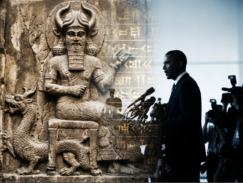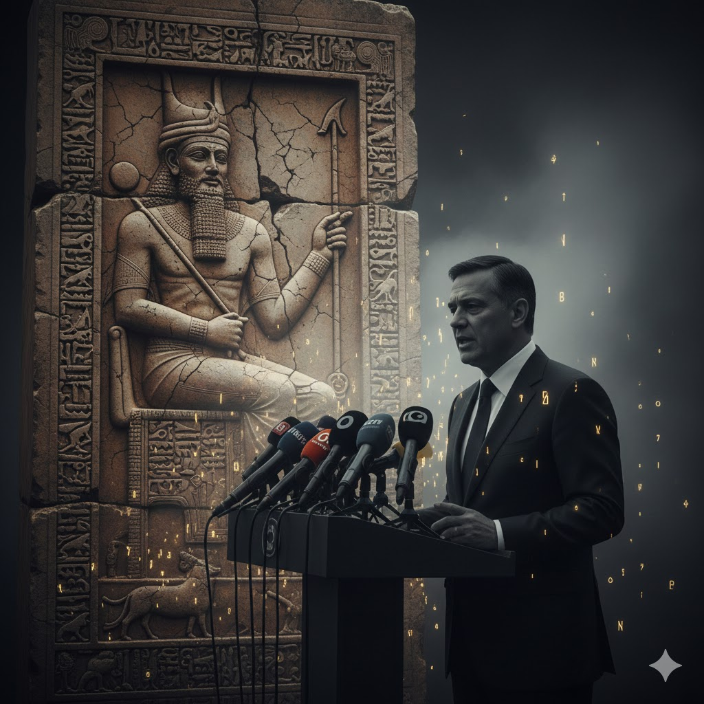 - Description: A double-exposure image blending a Sumerian stone relief of Marduk with a modern silhouette of a powerful political leader at a podium.