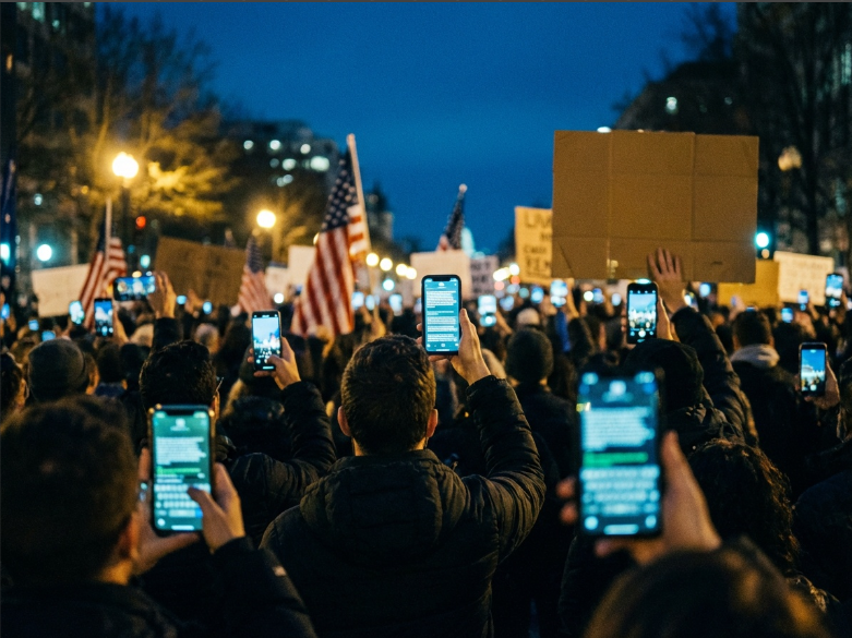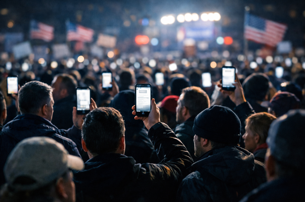 Prompt: Cinematic photorealism, large crowd at night seen from behind, American flags and rally signs suggested but not readable, hundreds of glowing phone screens displaying blurred document pages and headlines (no readable real text), faces tense and convinced, cool night tones with natural warm highlights, shallow depth of field, landscape 16:9.