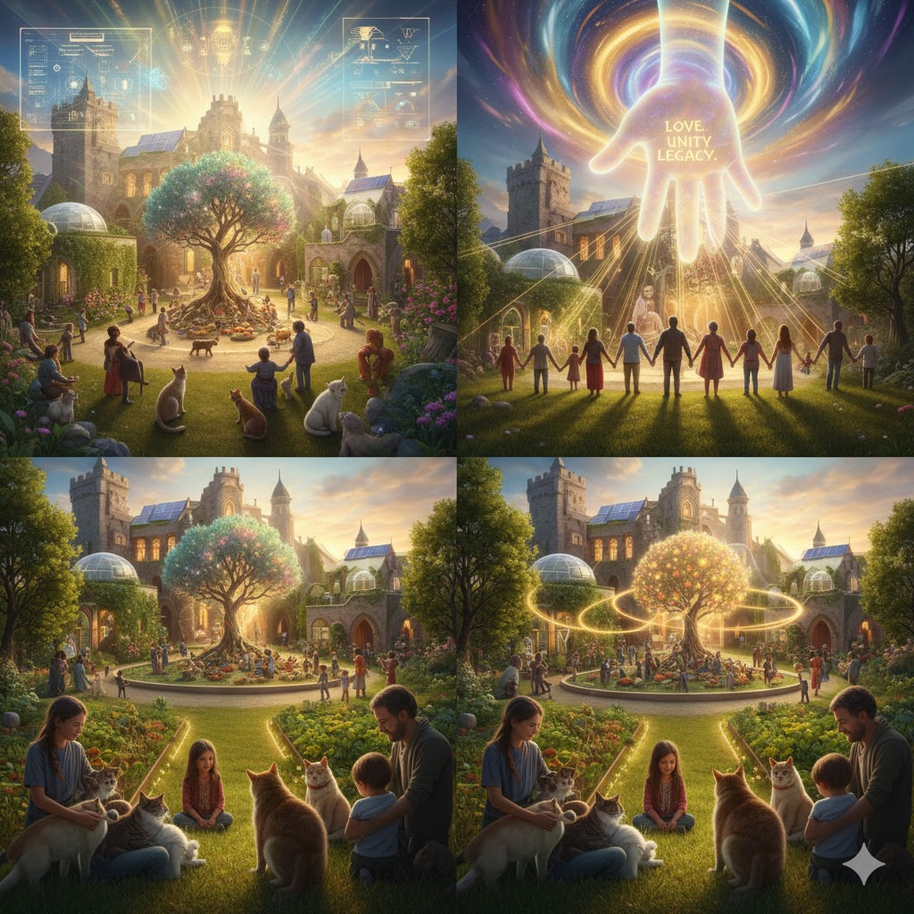 - Prompt: A majestic, restored Victorian estate and ancient castle standing side-by-side in a lush, verdant landscape at dawn. Overlaid across the scene is a subtle, glowing golden holographic geometric grid and light-codes. In the foreground, a diverse group of humans and animals walk together in peace. Hyper-realistic, ethereal lighting, 8k resolution, cinematic atmosphere.