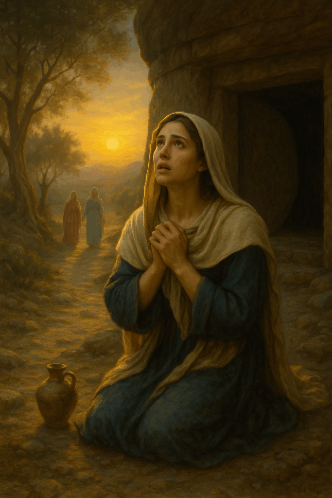 At dawn, Salome kneels beside the empty tomb, the first rays of the sun illuminating her tear-streaked face. A jar of anointing oil rests beside her. She looks upward, sensing the presence of her beloved teacher, now risen. Behind her, the stone door of the sepulcher lies open, and two women approach from a distance — Mary Magdalene and Mary, the mother of Yeshua—the air hums with divine energy, symbolizing the dawn of a new consciousness.
