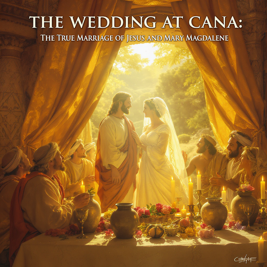 - The Wedding at Cana: The True Marriage of Jesus and Mary Magdalene – a realistic artistic depiction of an ancient Jewish wedding, featuring Jesus and Mary Magdalene as the bride and groom, stone jars of wine, disciples celebrating, and warm candlelight.