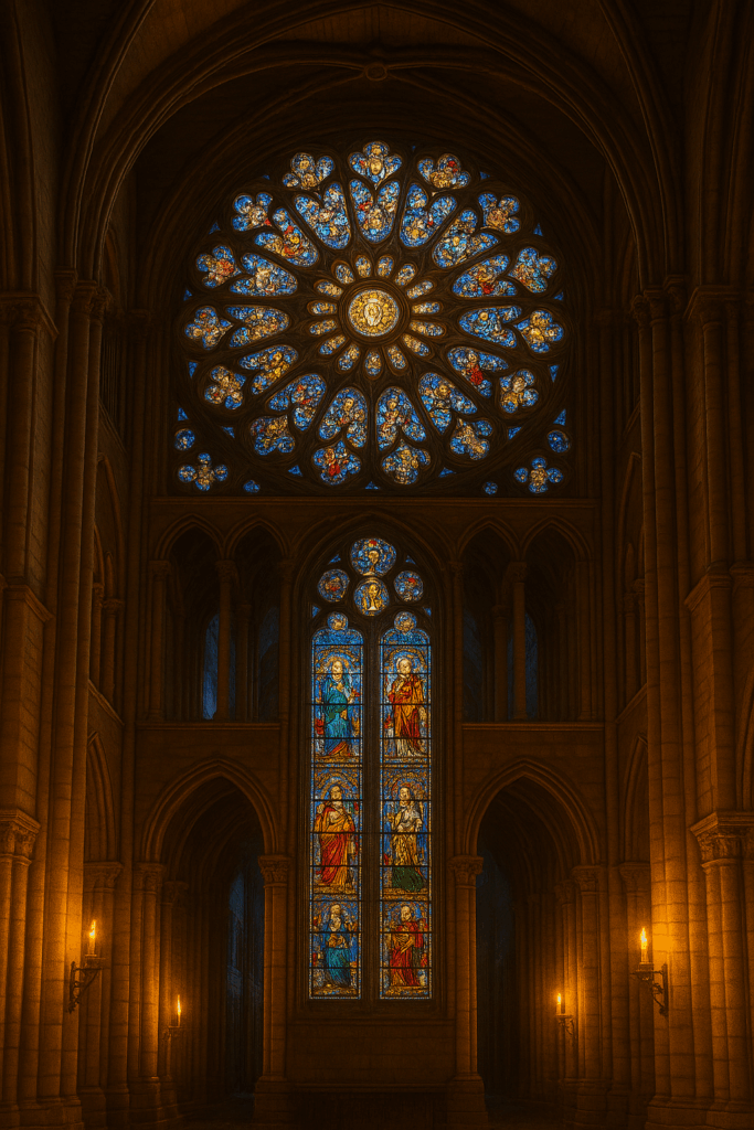Architectural symbolism across European cathedrals encodes her lineage: