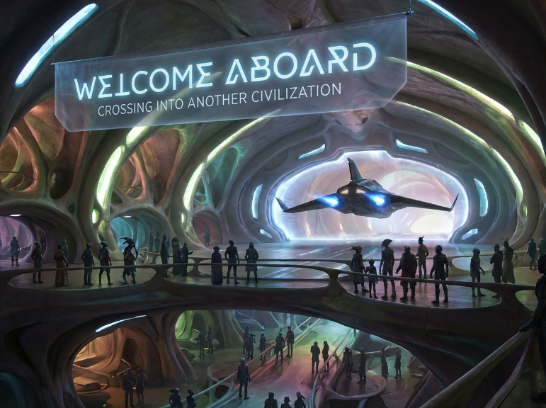 Prompt: A shuttle entering a vast hangar bay inside an alien mothership. Multiple species visible as silhouettes. Immense interior scale, glowing architecture, realistic sci-fi.