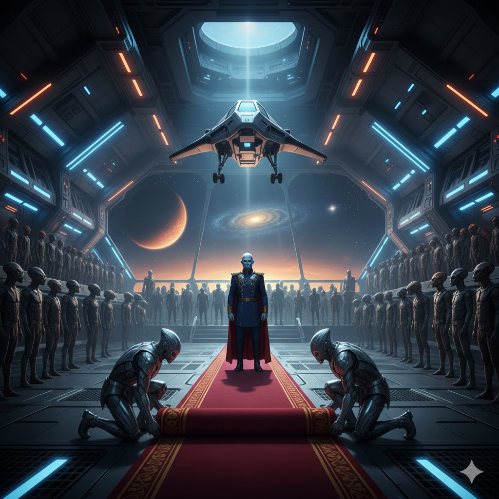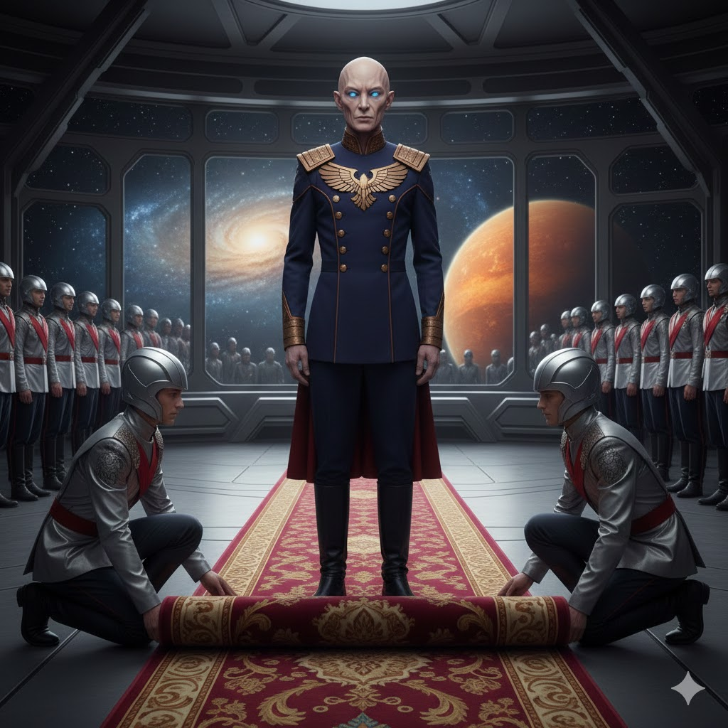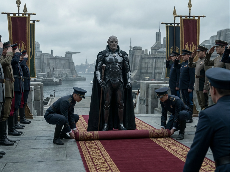 Prompt: A tall, dignified humanoid commander with subtle non-human features standing on a ceremonial deck as a red-and-gold carpet is unrolled. Military honor, calm authority, cinematic realism.