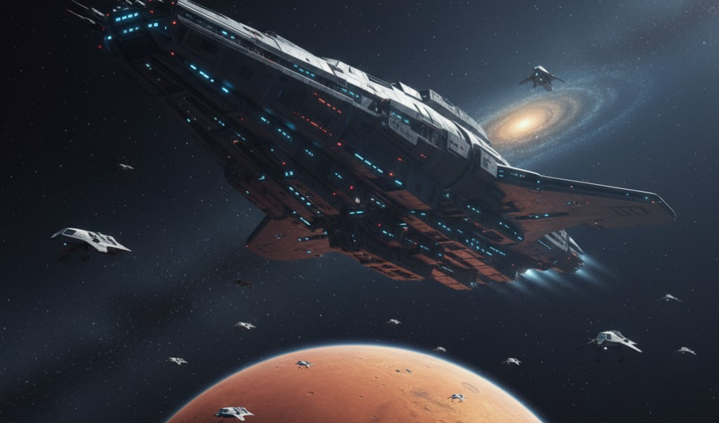 Prompt: A colossal alien command ship near Mars, hundreds of miles long, dwarfs the planet. Smaller craft move around it like insects. Epic scale, cinematic lighting, realistic space physics.