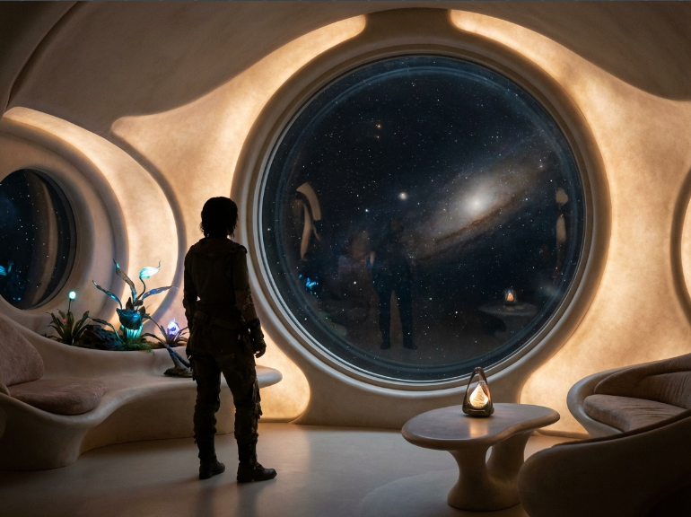Prompt: A quiet alien living quarters with a window overlooking deep space. A human figure stands alone, stars reflected on glass. Anticipation, silence, and destiny. Soft lighting, emotional depth.