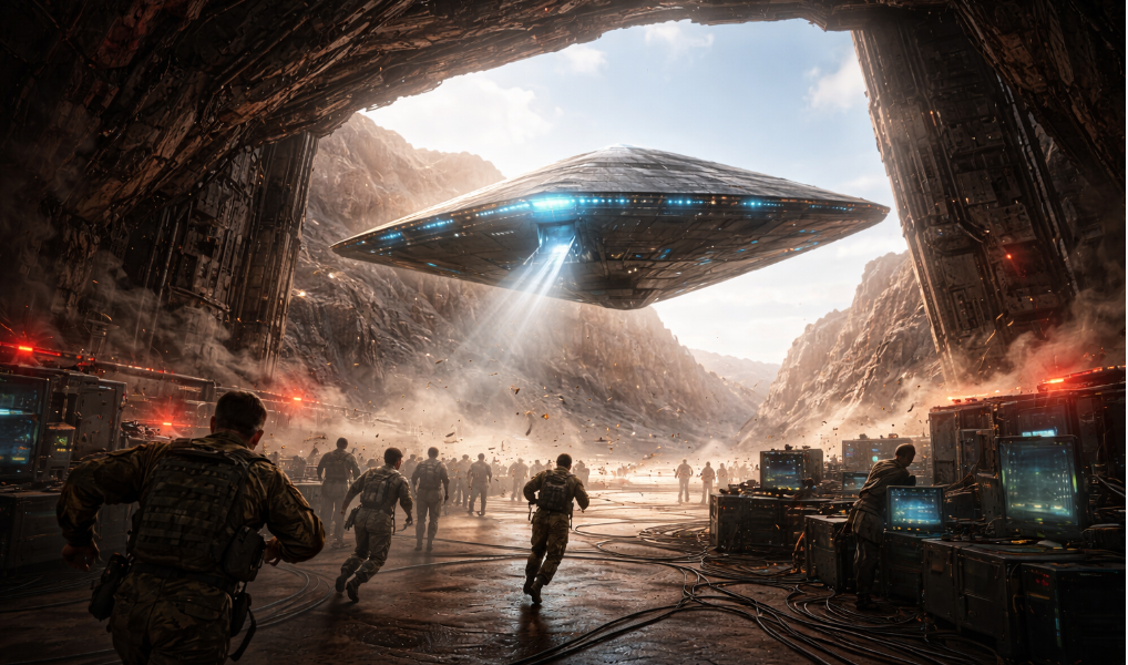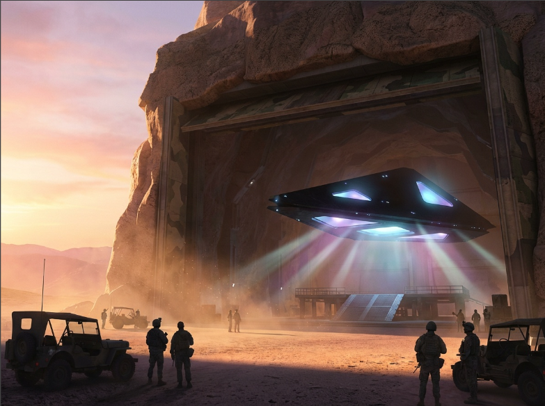Prompt: The alien craft lifts through a massive hangar door into bright New Mexico sunlight while alarms flash below. Personnel scatter in shock. Dynamic motion, dramatic contrast, cinematic realism.