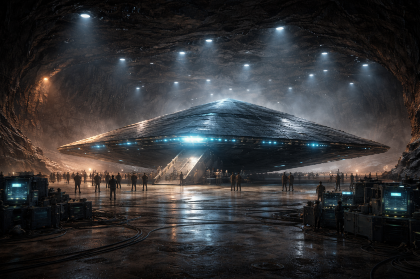Prompt: A triangular alien spacecraft inside a massive underground hangar carved into rock. The craft is metallic, smooth, and humming with intelligence. Scientists and technicians appear small beside it. Cinematic lighting, realistic scale, awe-inducing composition.